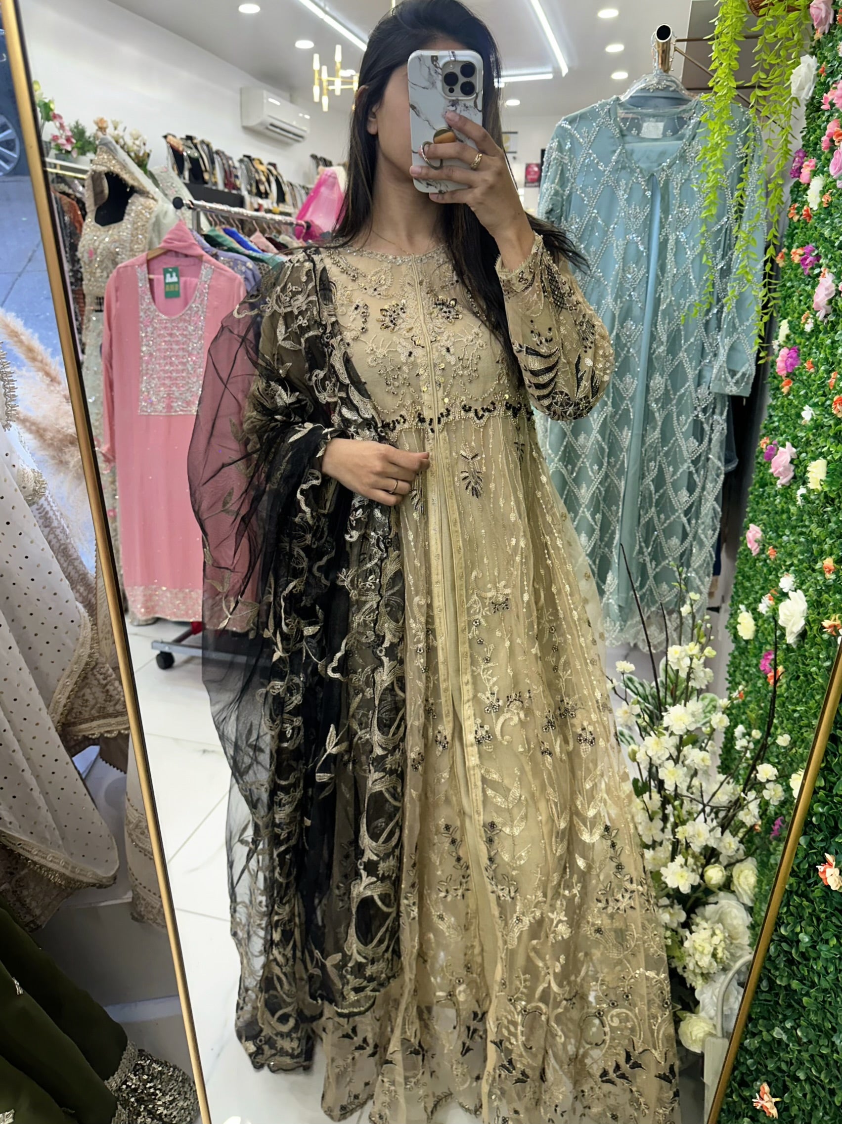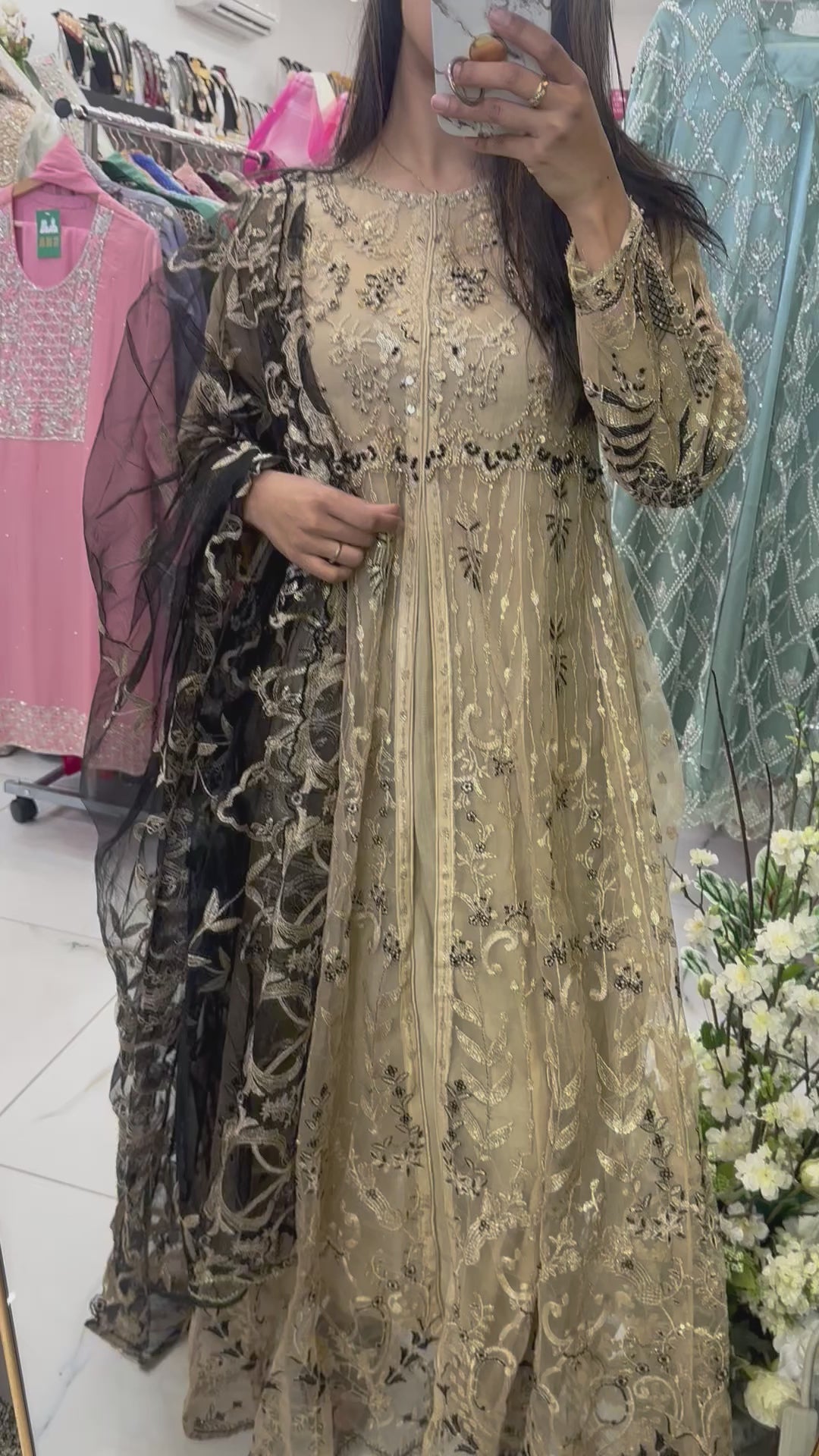 Bet maxi with cotton inner lining. Beautiful embroidery & stone bead work. Full three piece set