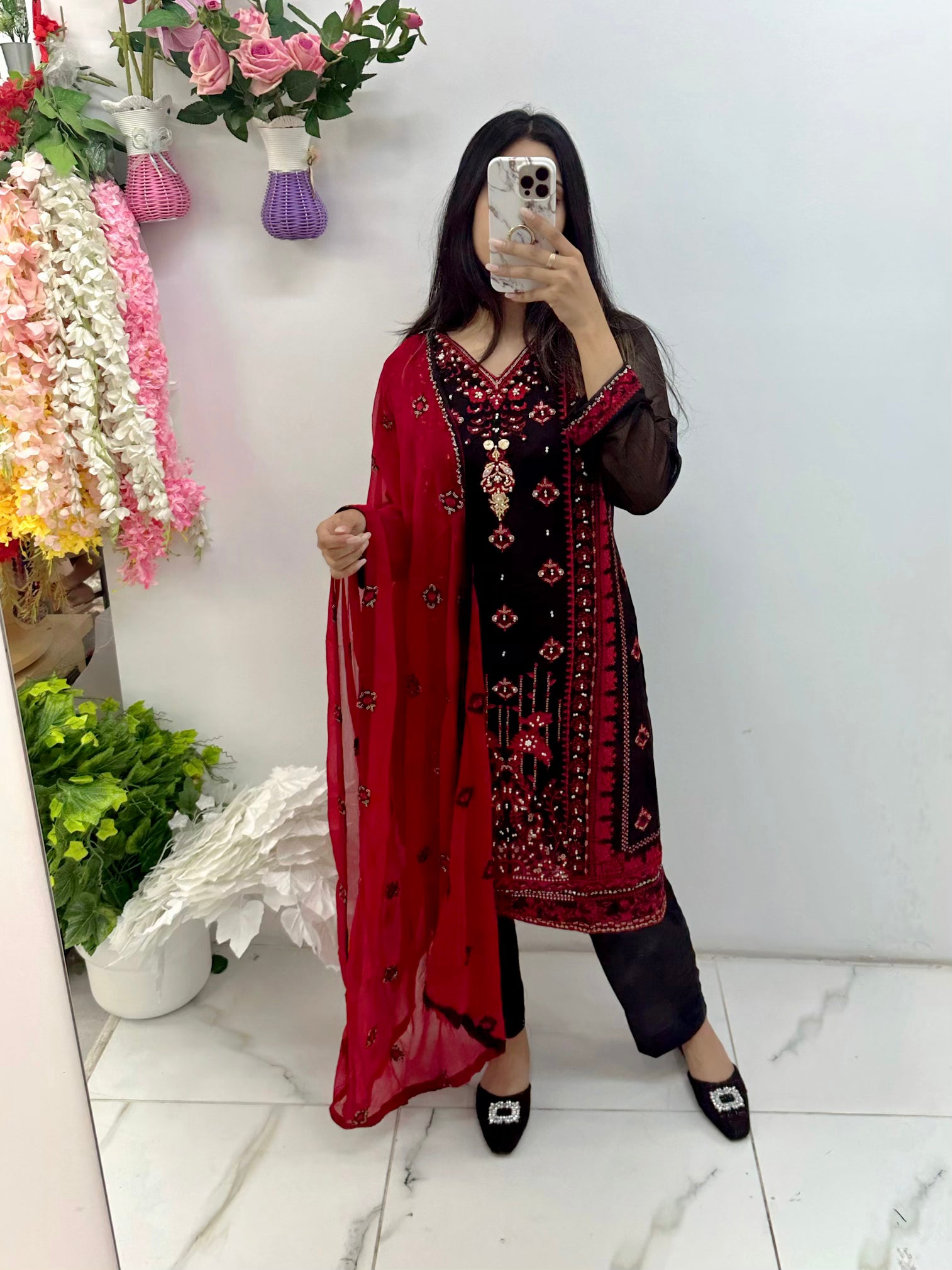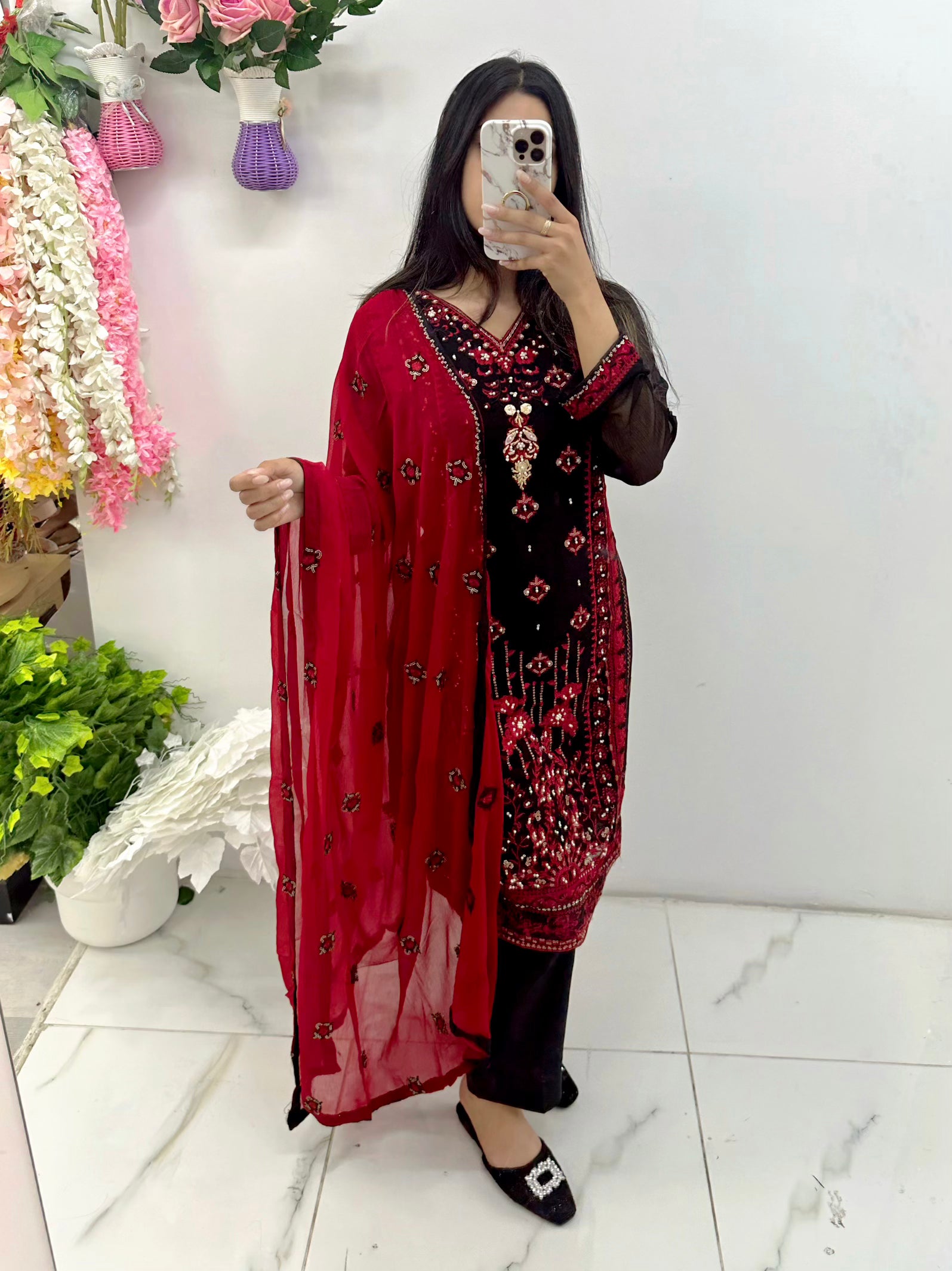 Beautiful chiffon suit with hand work and lacing. Comfy silk pants and all over work duppata