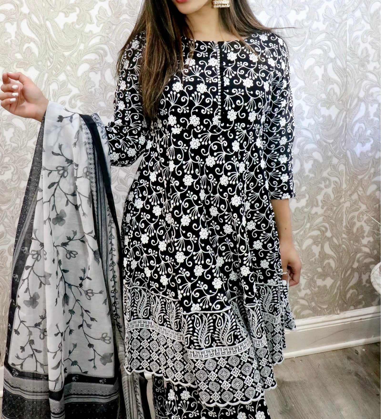 Black and white chikankari detailed sharara suit