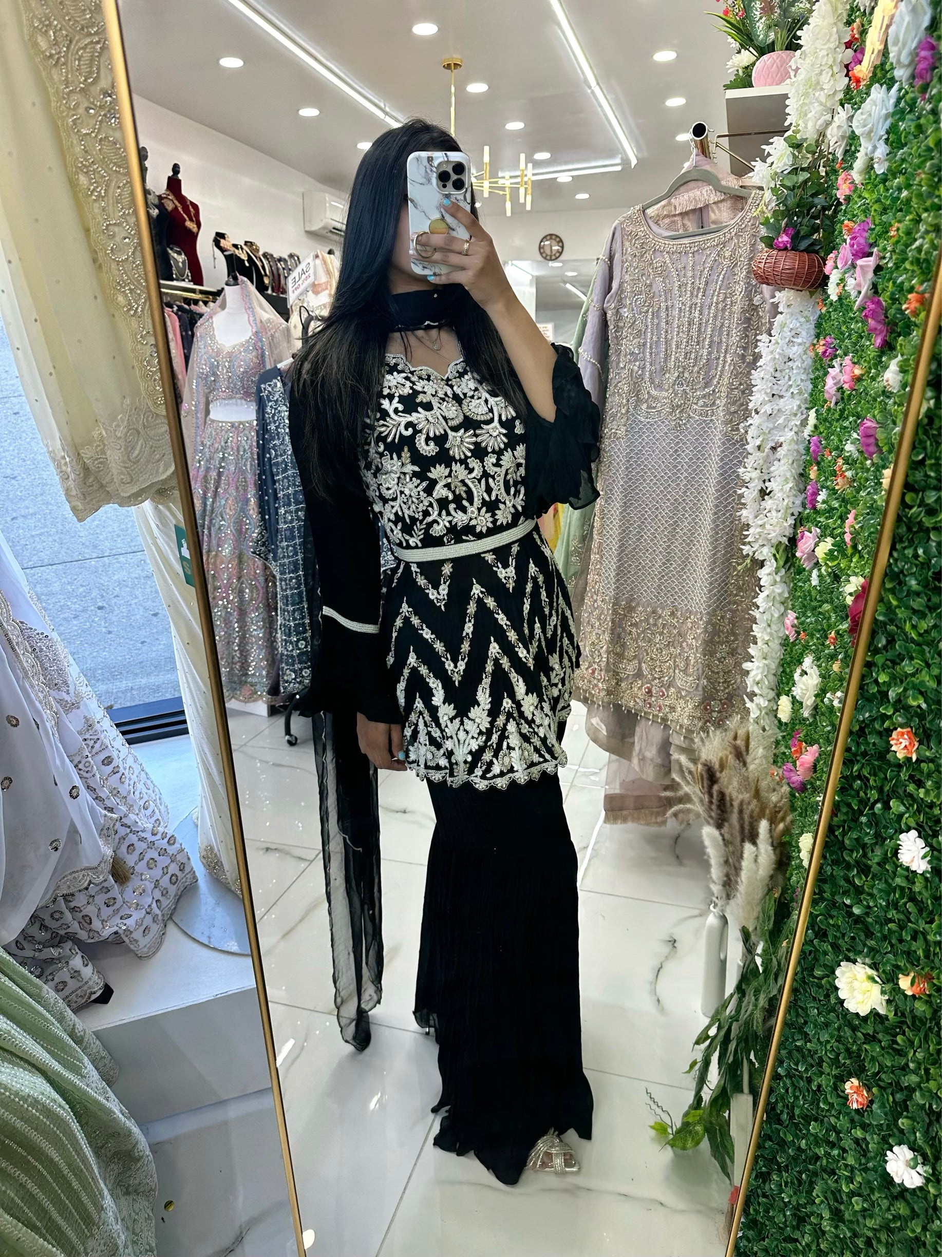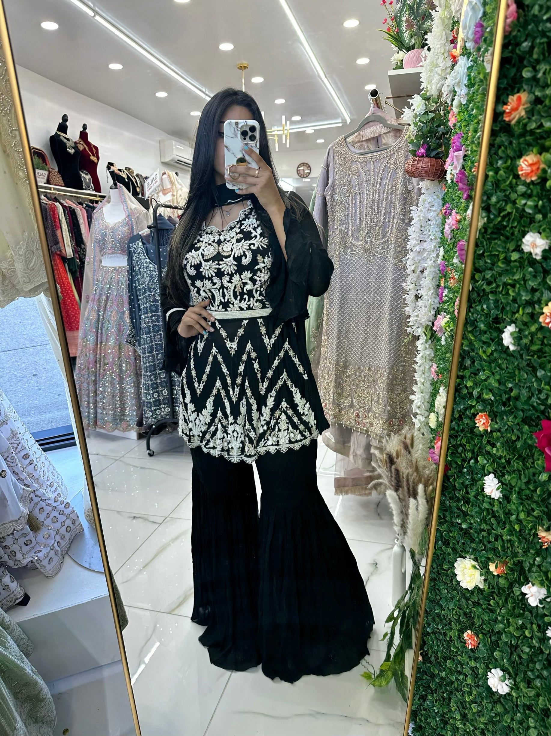 Black and white hand work belted gharara suit