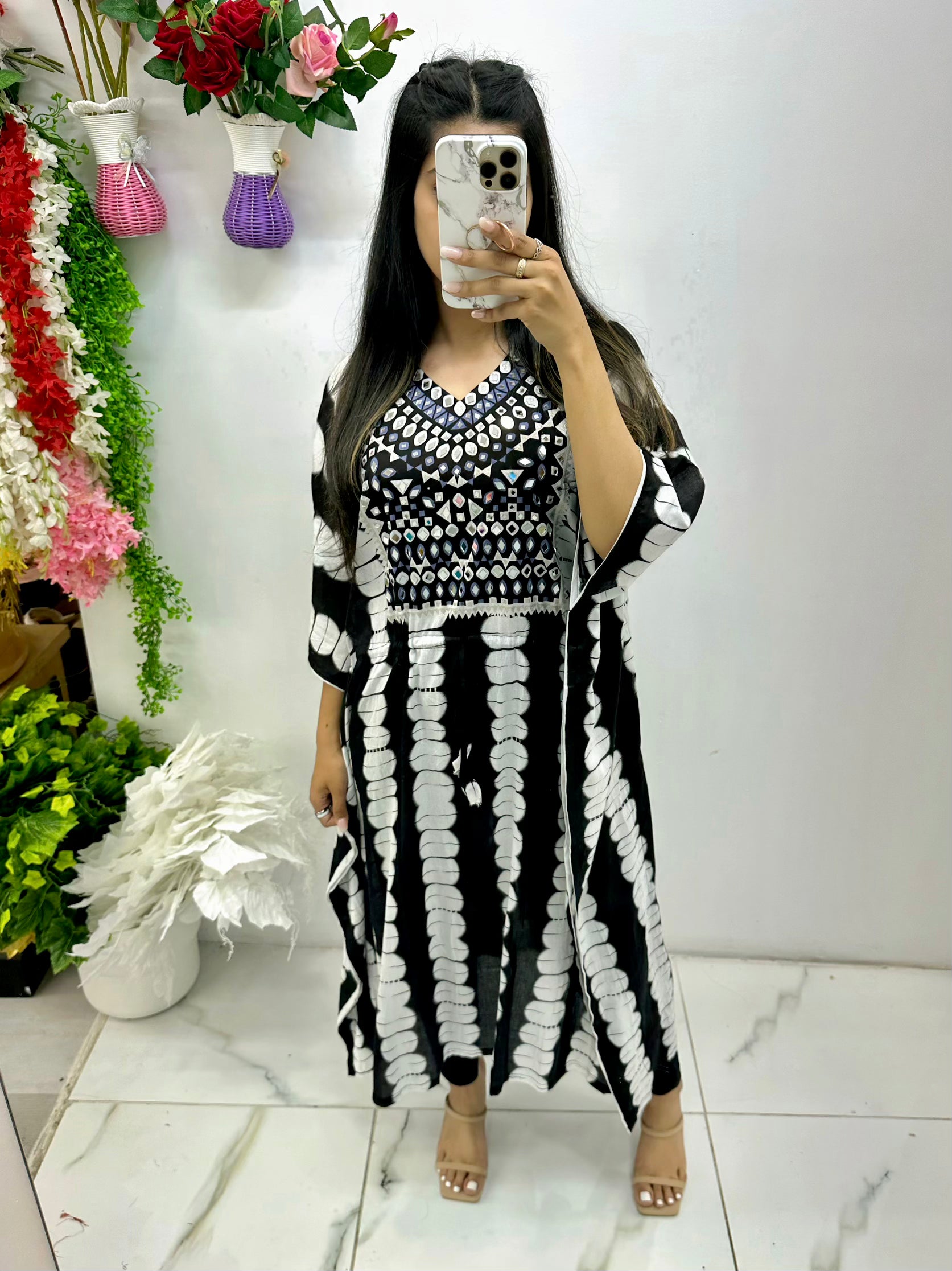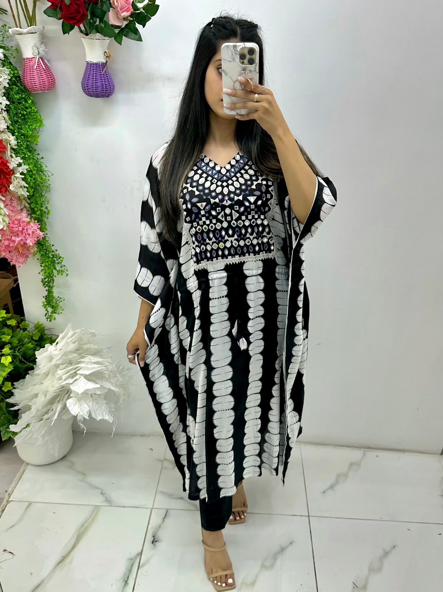 Cotton with mirror work. Free size, will fit most people from 36-44 chest size