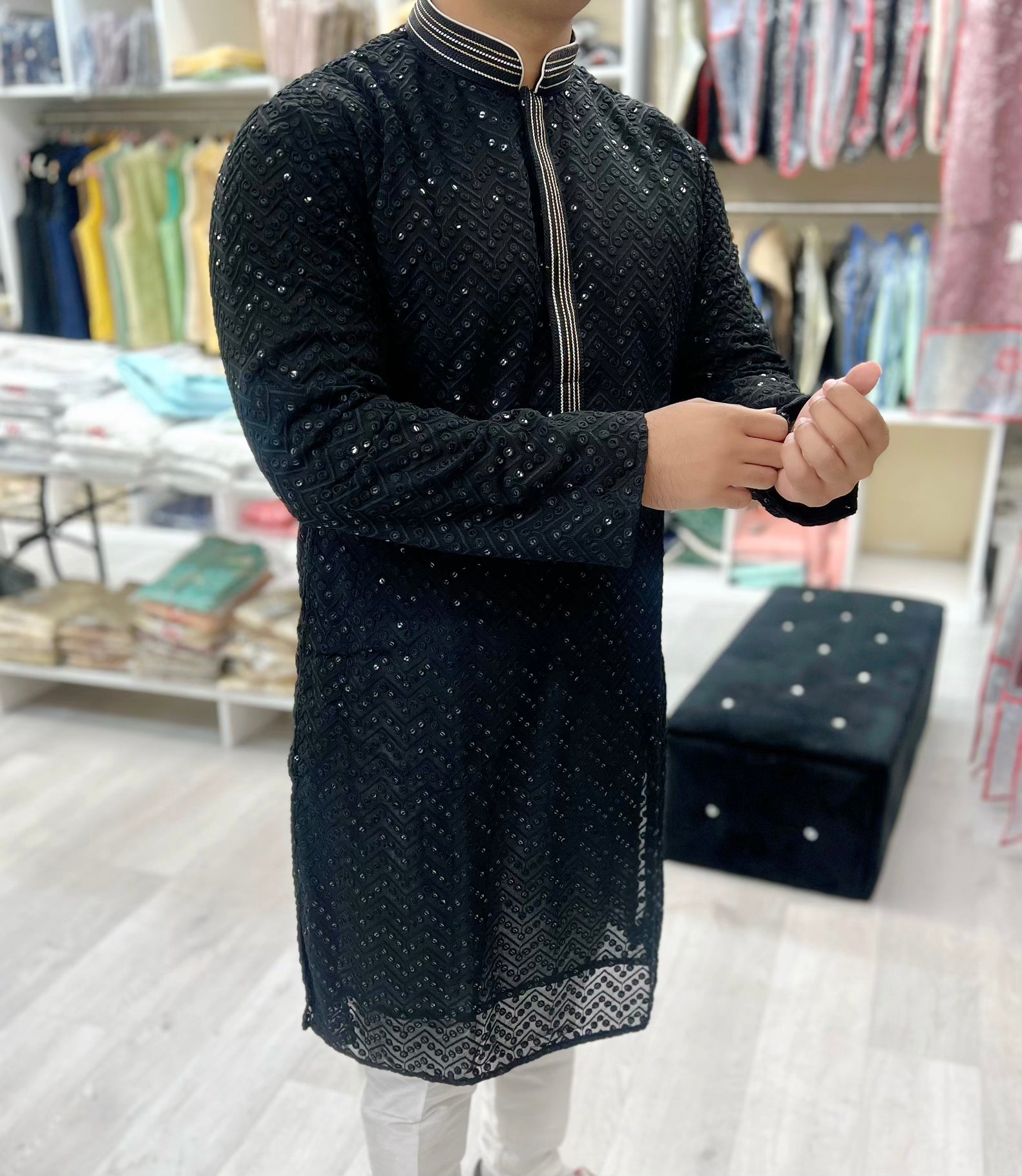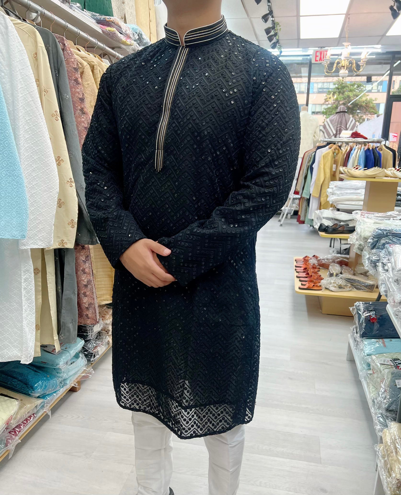 Black chiffon sequence with cotton lining, soft silk off white straight pants