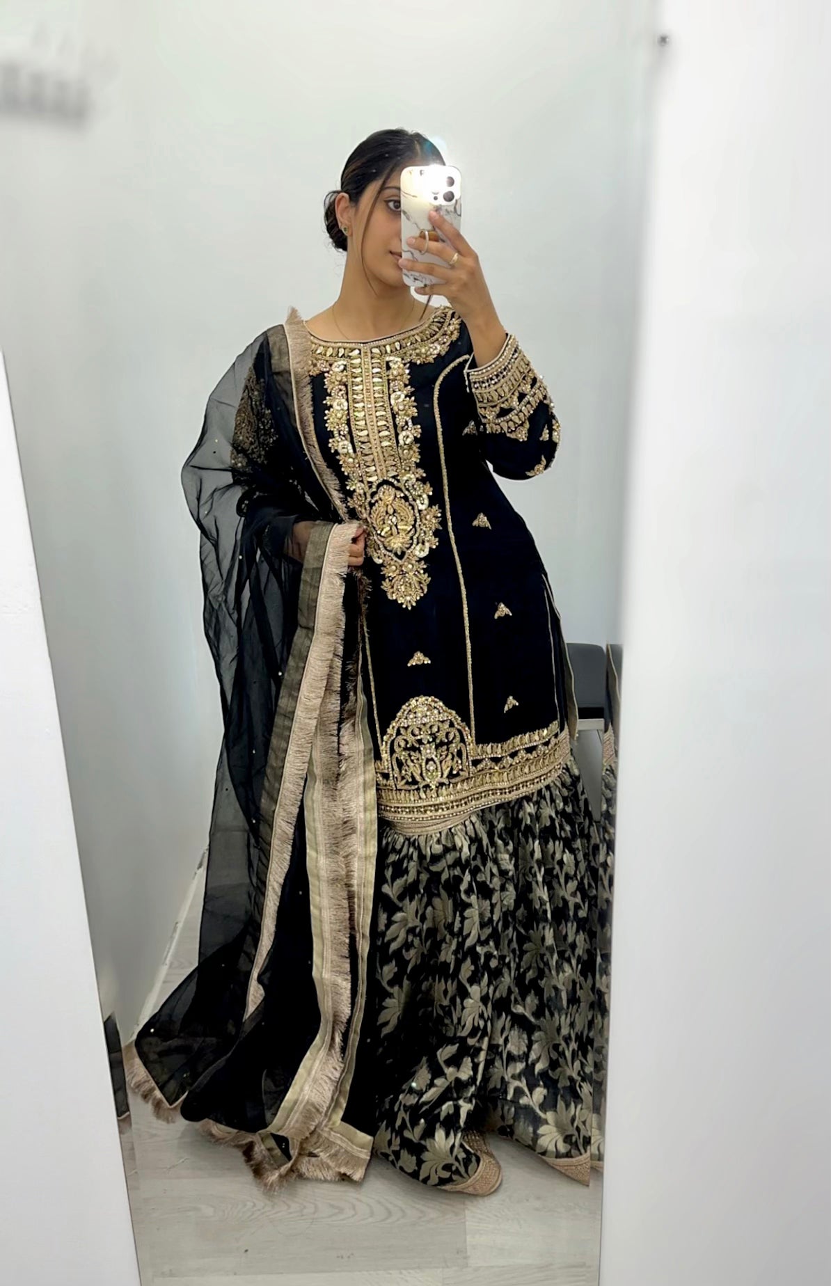 All hand work on organza fabric. Banarasi gharara pants with lots of flare