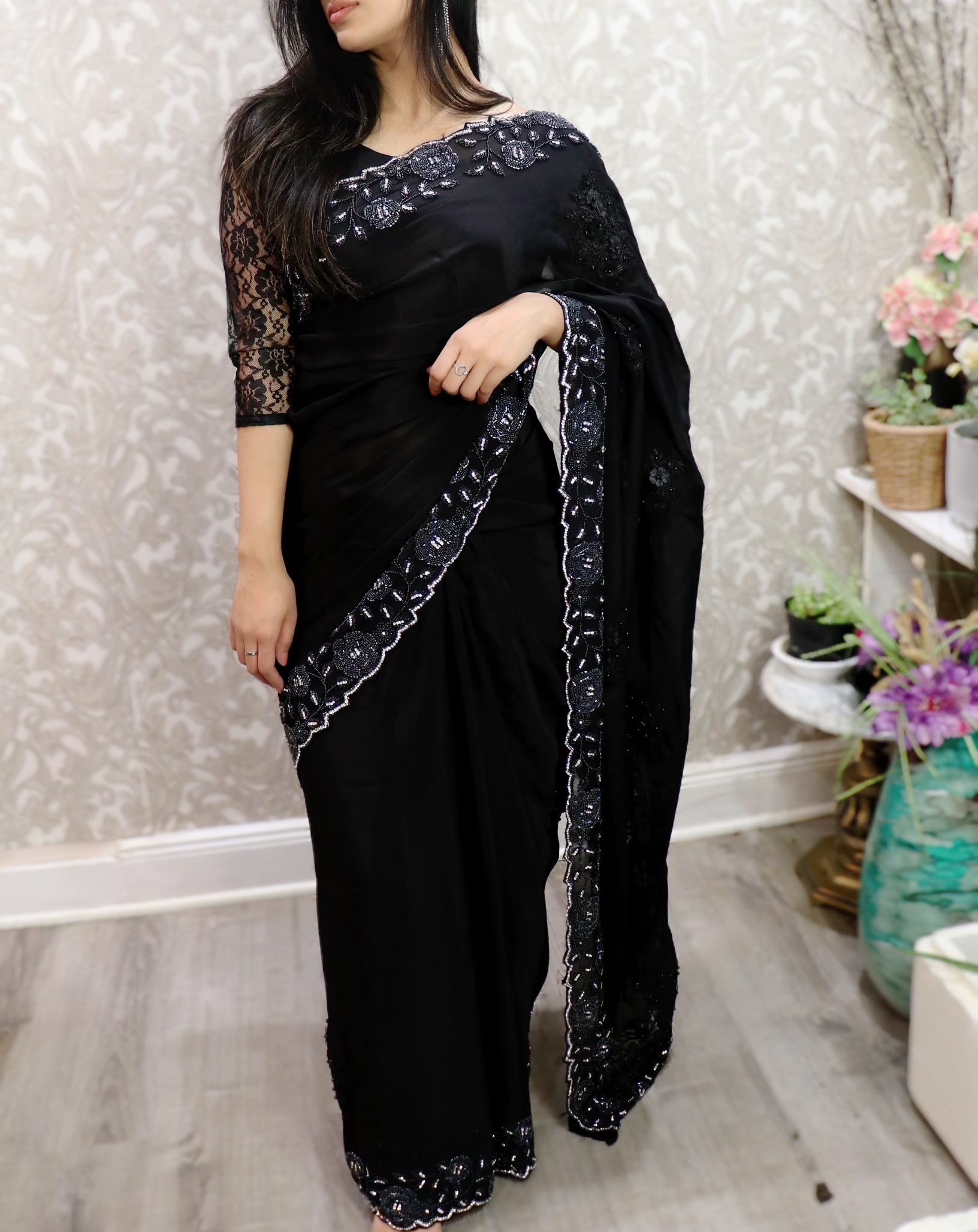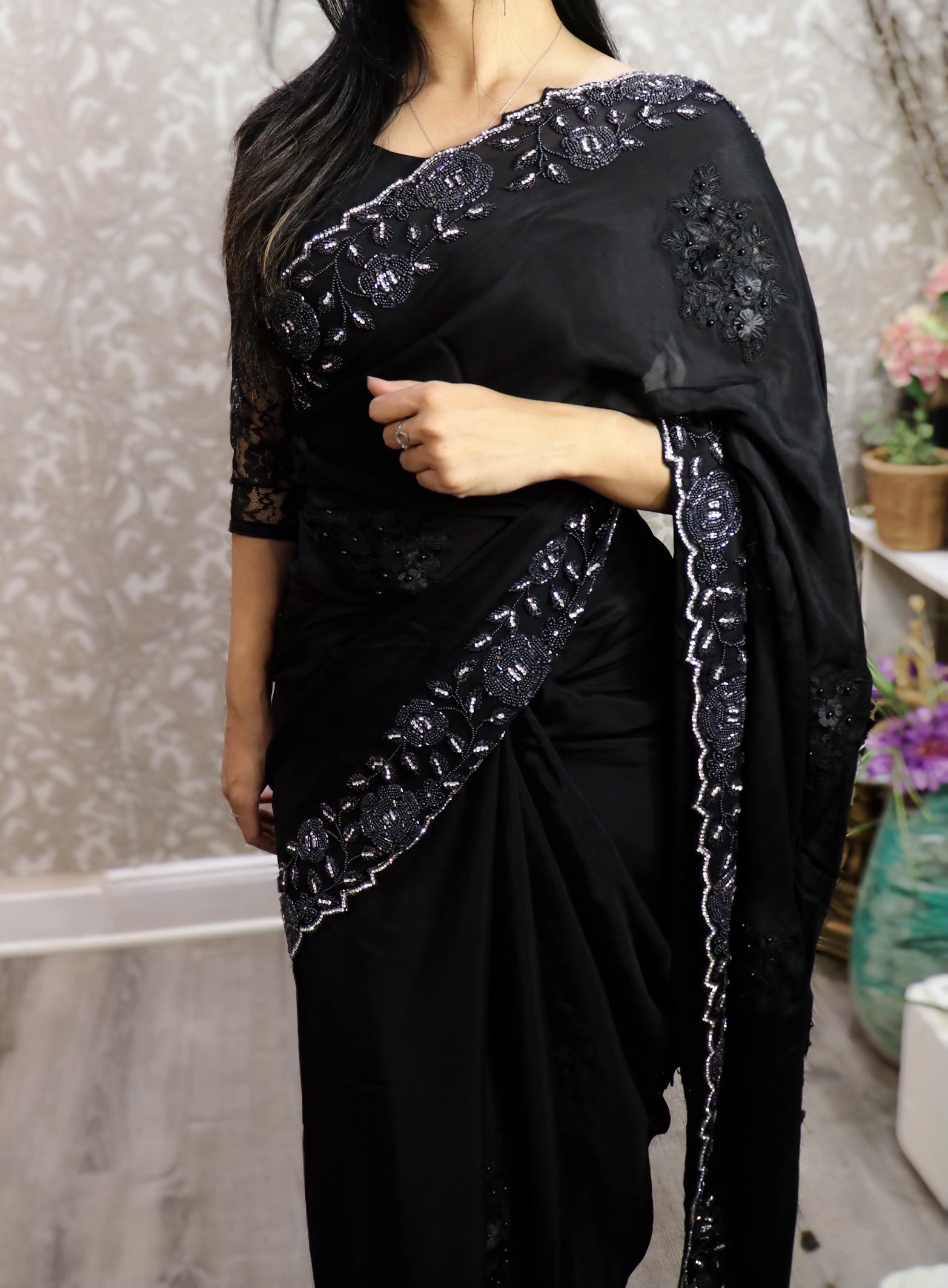Light weight party wear satin silk black saree beautifully detailed with beads and crystal florals. Comes with a beautiful unstitched black blouse piece with crystal work back and front