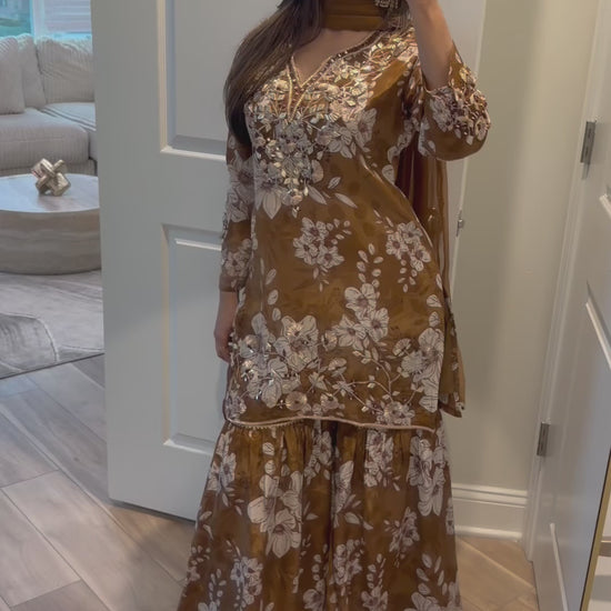 Brown silk floral gharara suit