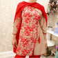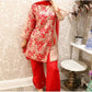 A very trendy and unique style three piece. Beautiful red color embroidery work on beige cotton with georgette duppata and red plazo pant.