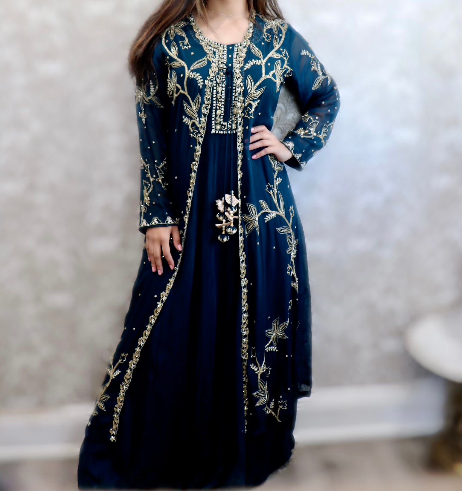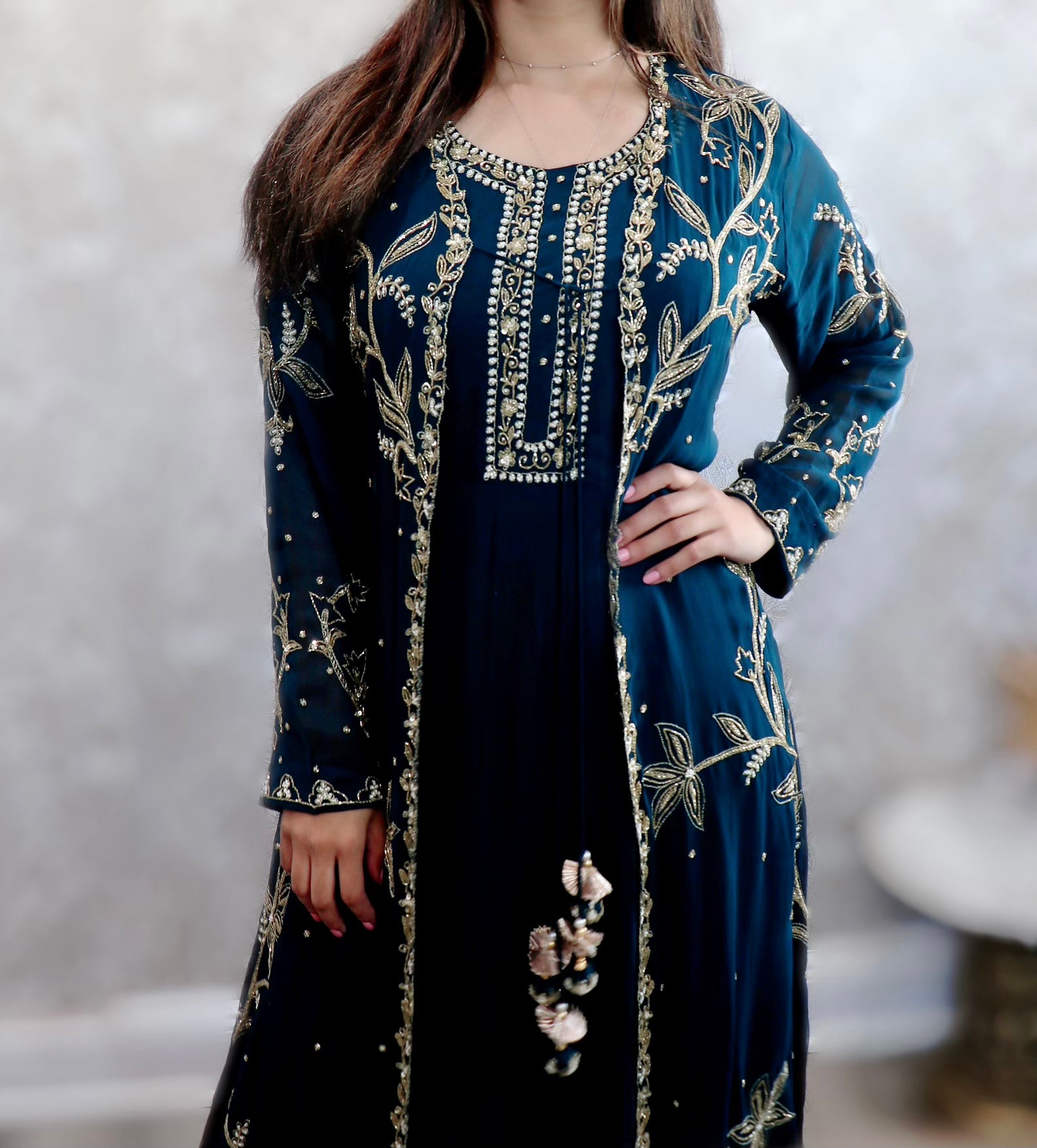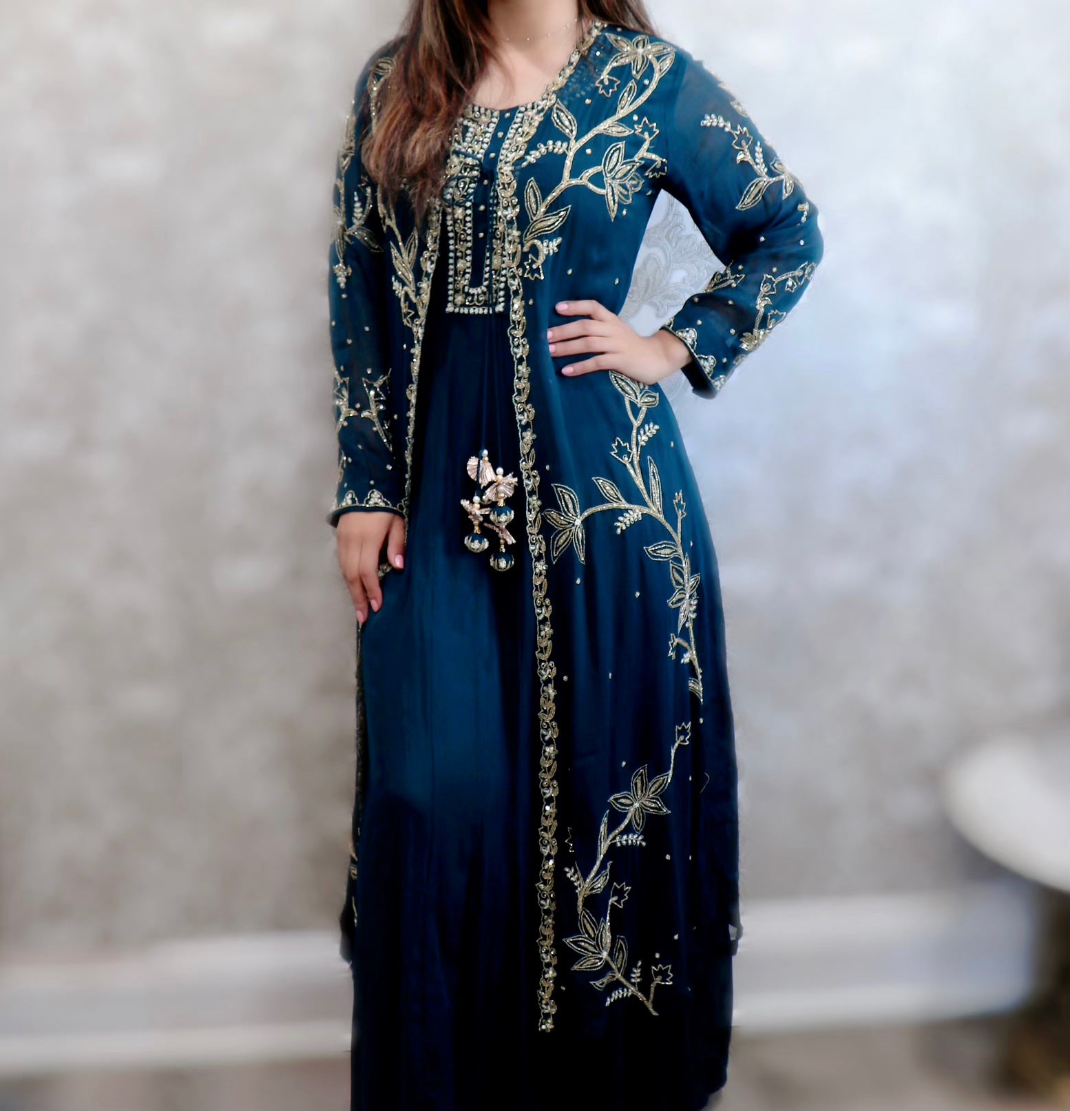 Deep sea green designer jacket gown