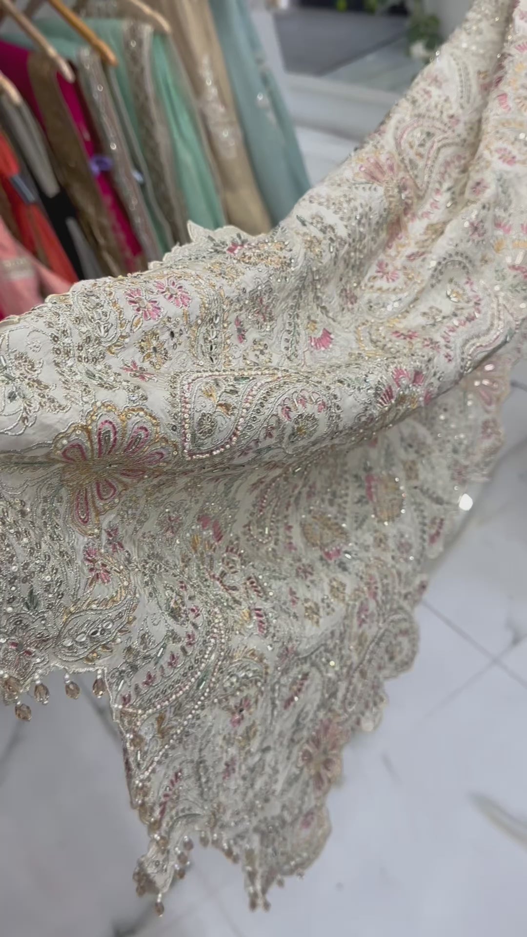 Exclusive cream long cape sleeve hand work two piece suit