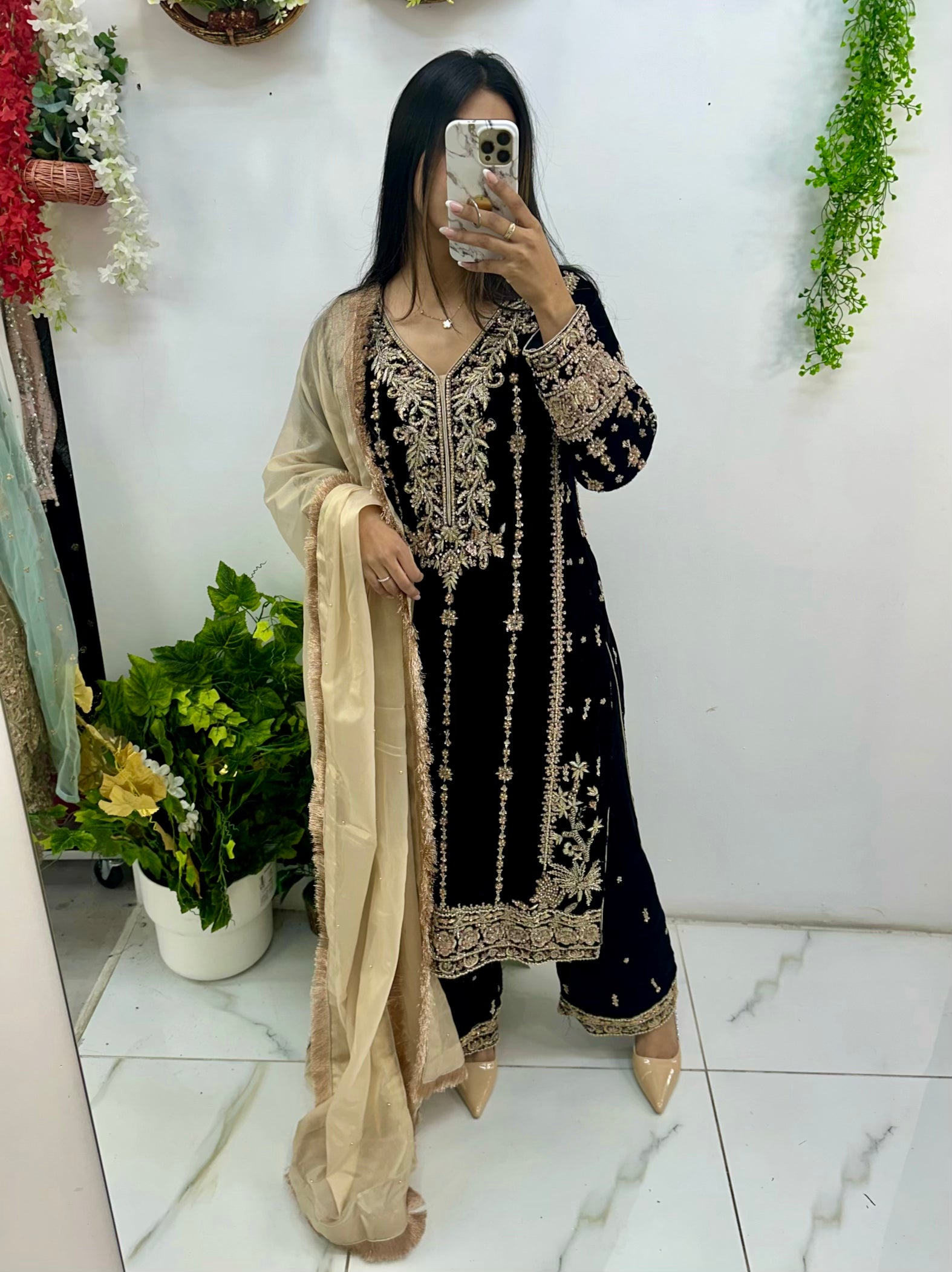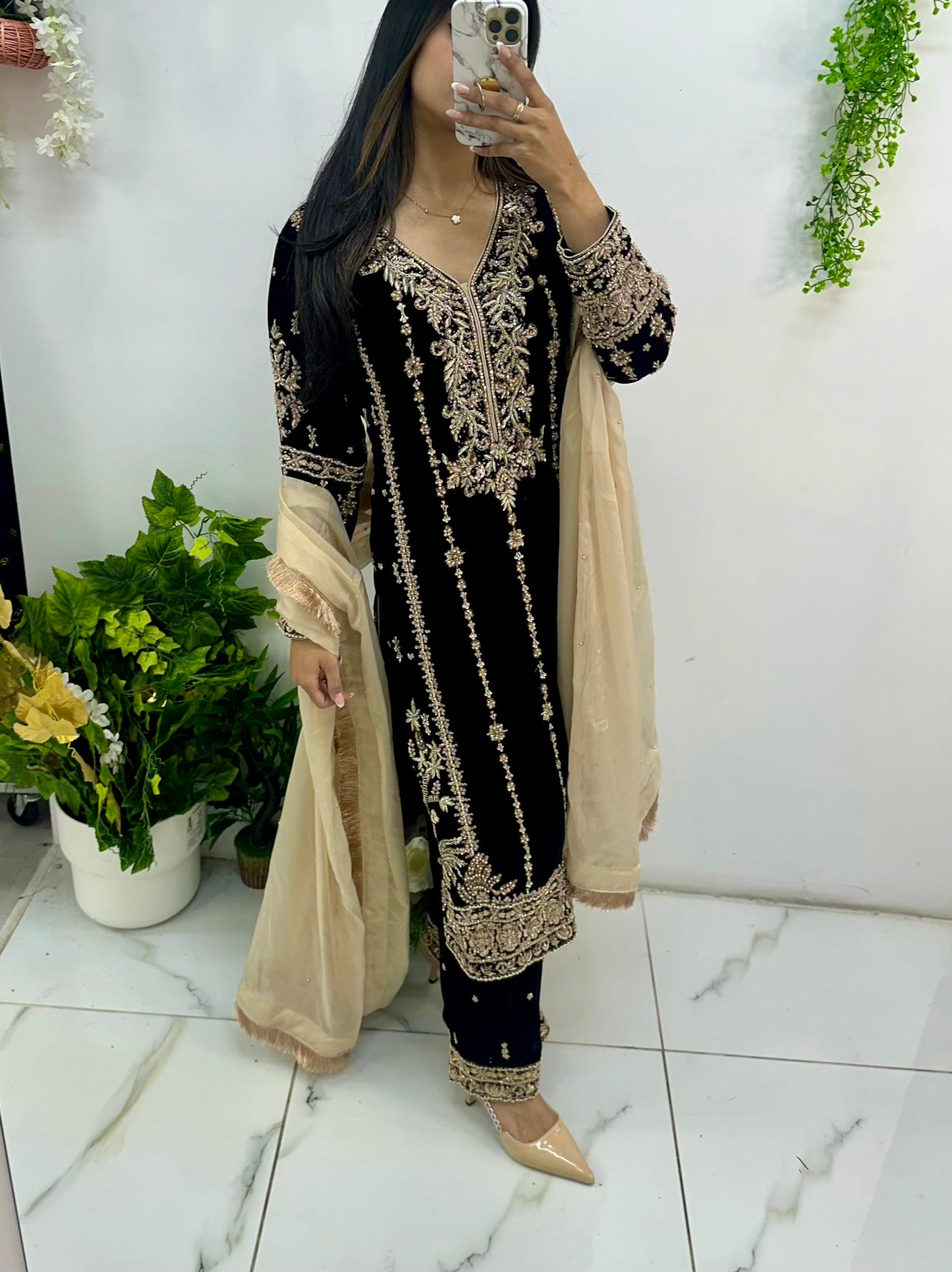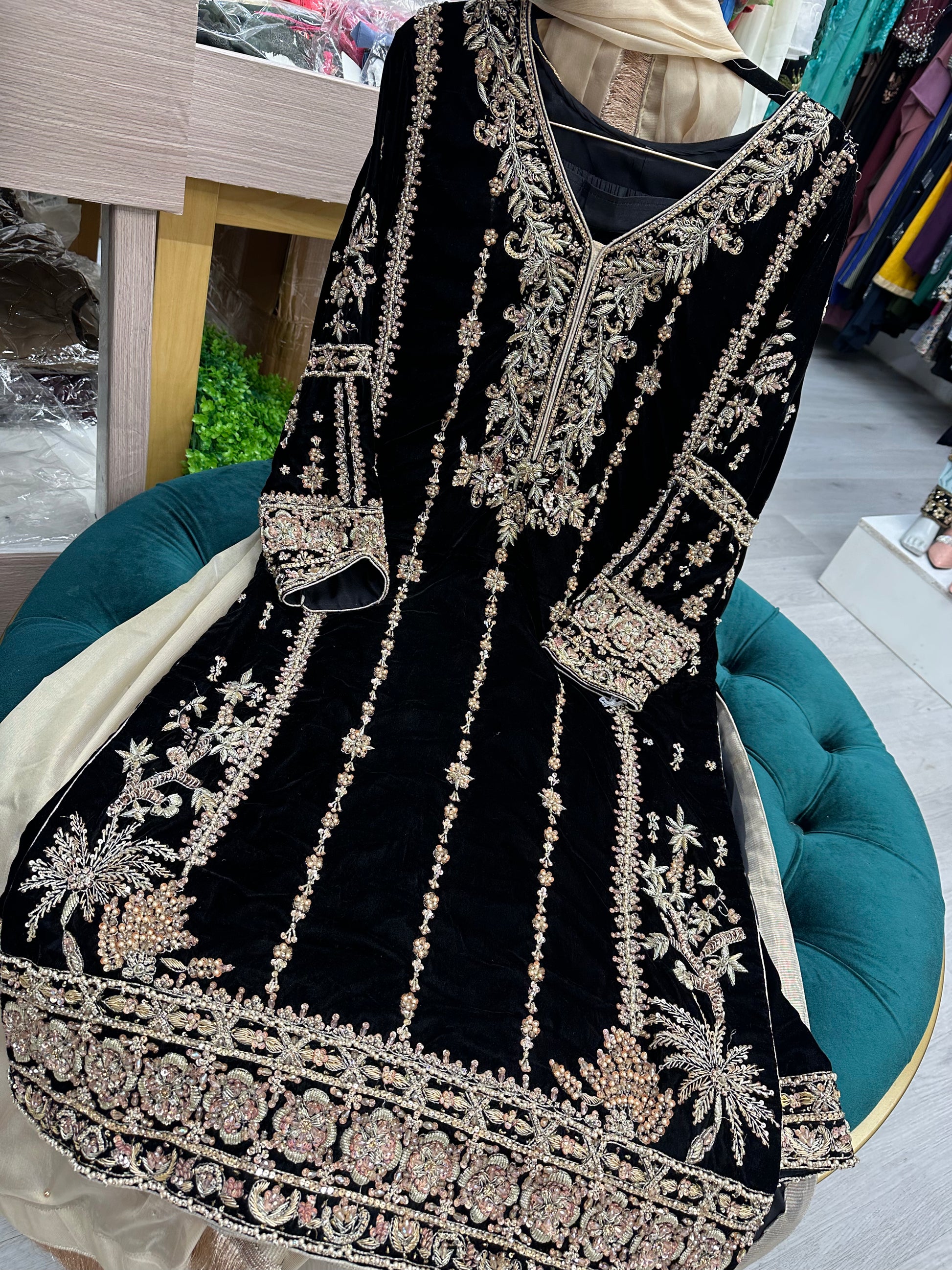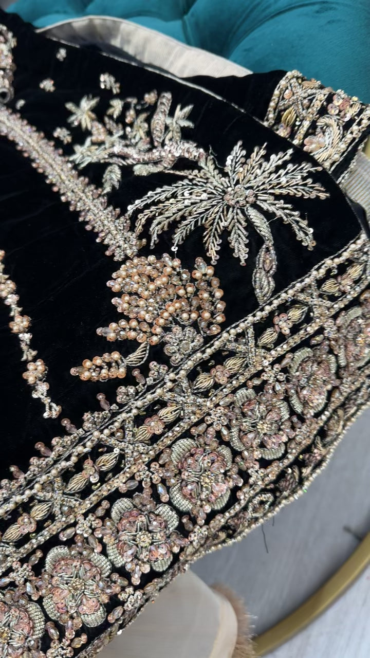 Black velvet three piece with very heavy hand work. Exclusive wear. For custom sizing please visit shop to place order