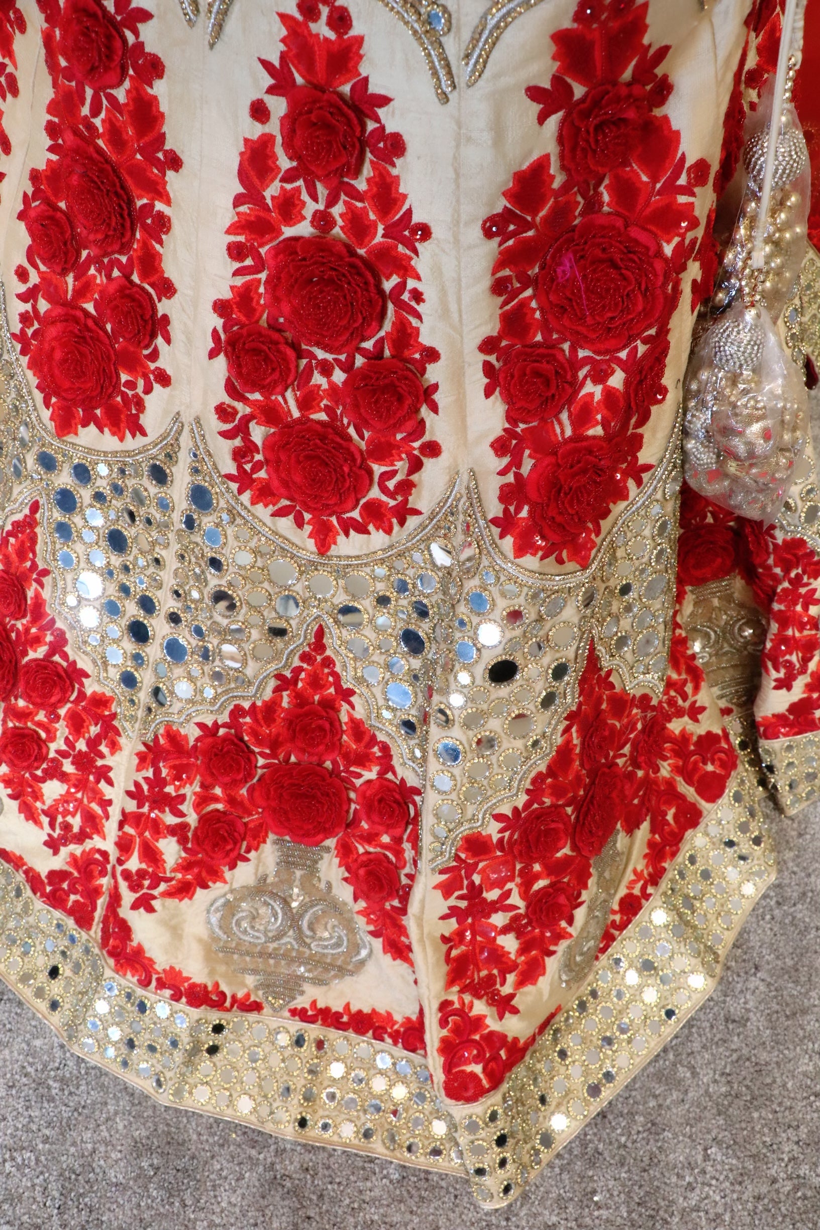 All details done on pure raw silk. Heavy beaded red flower work and all over mirror details. Blouse piece unstitched. High quality luxurious bridal lehenga