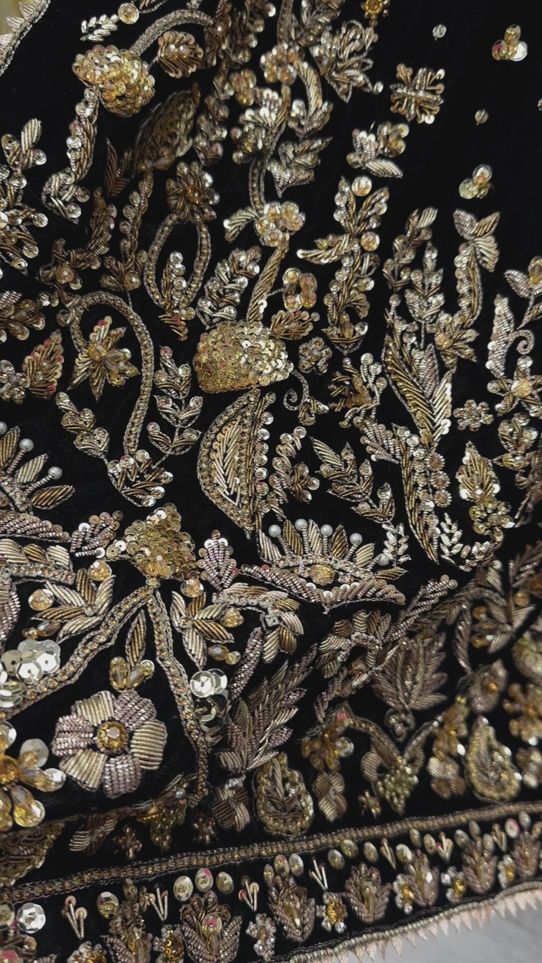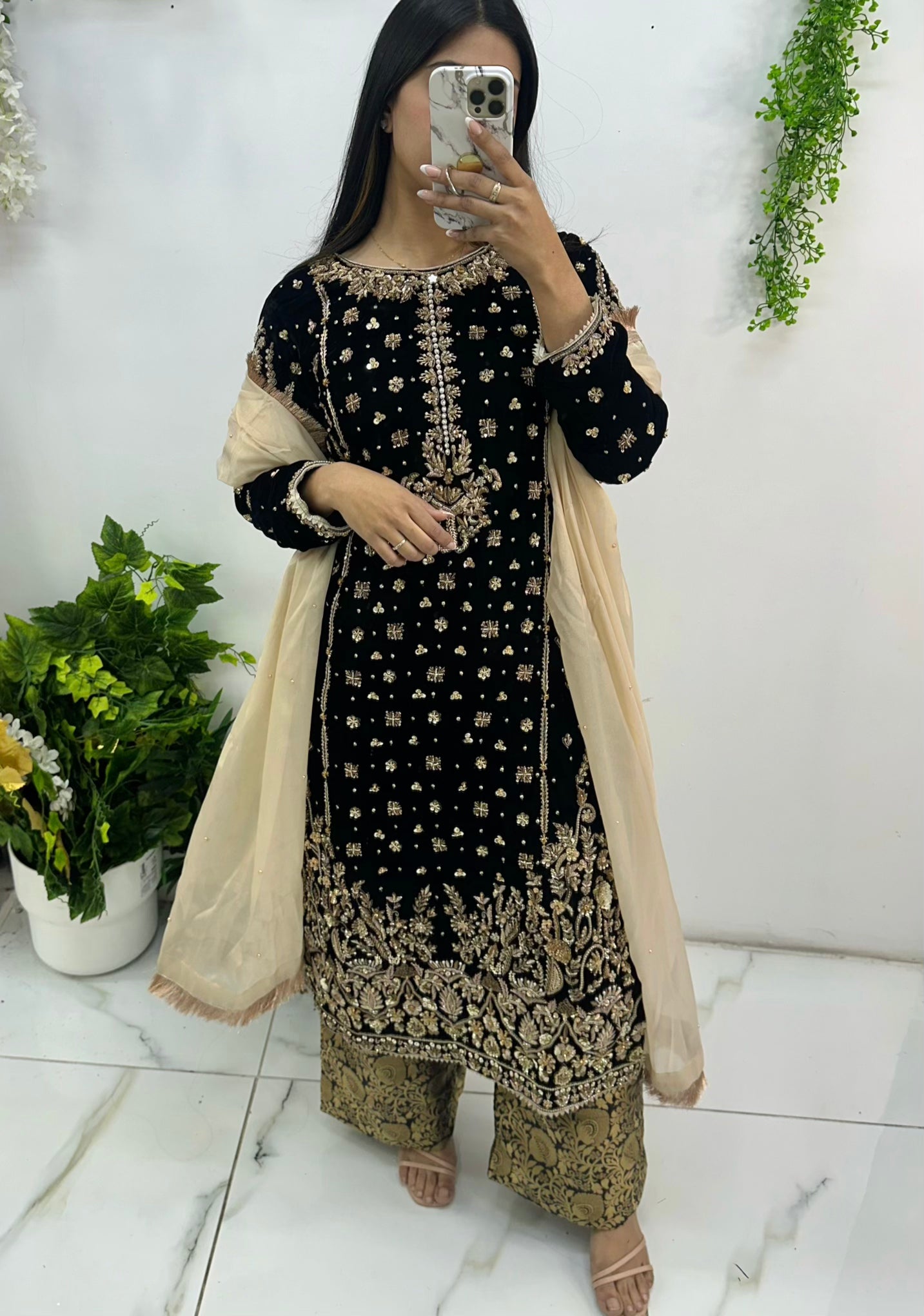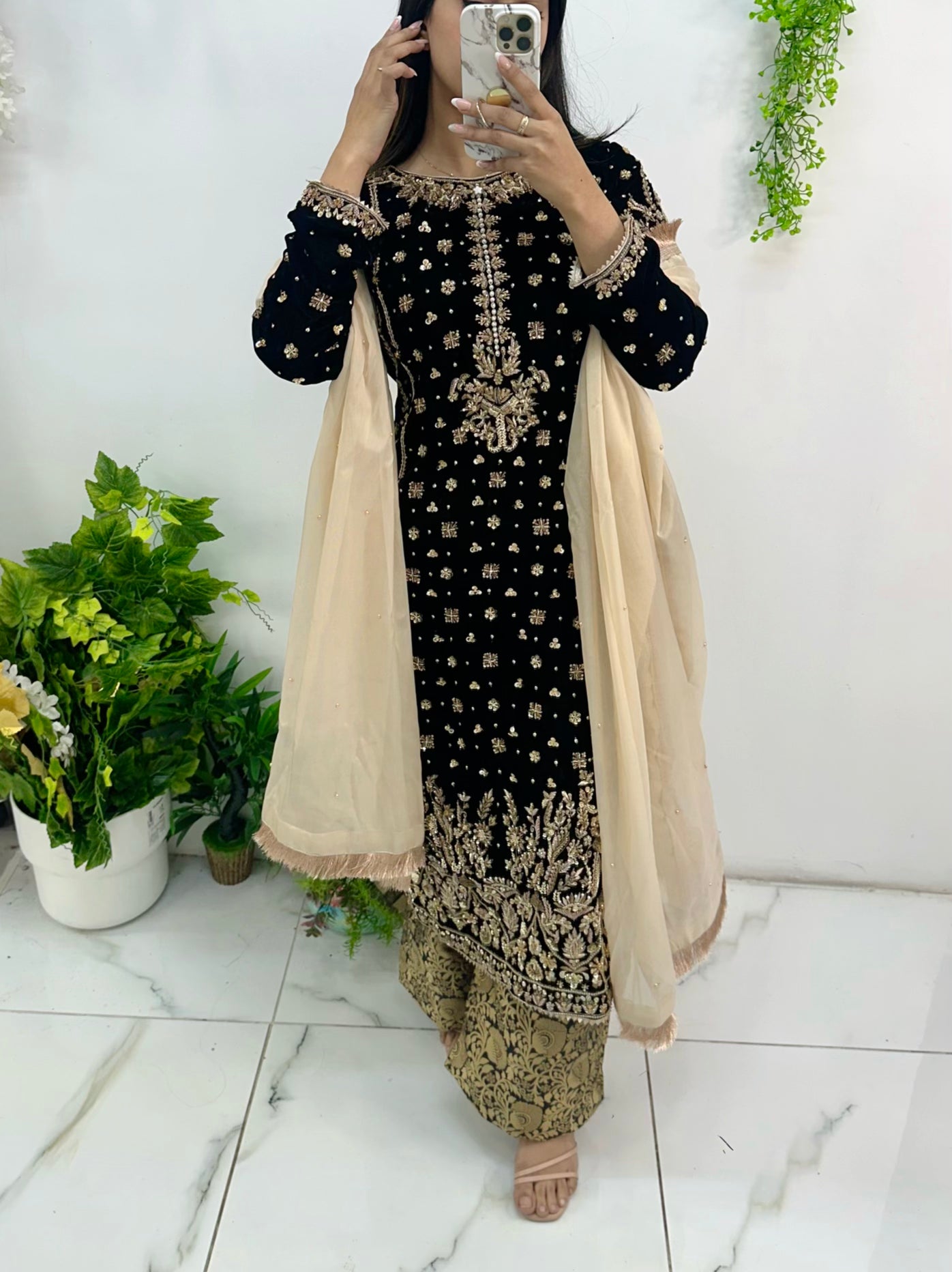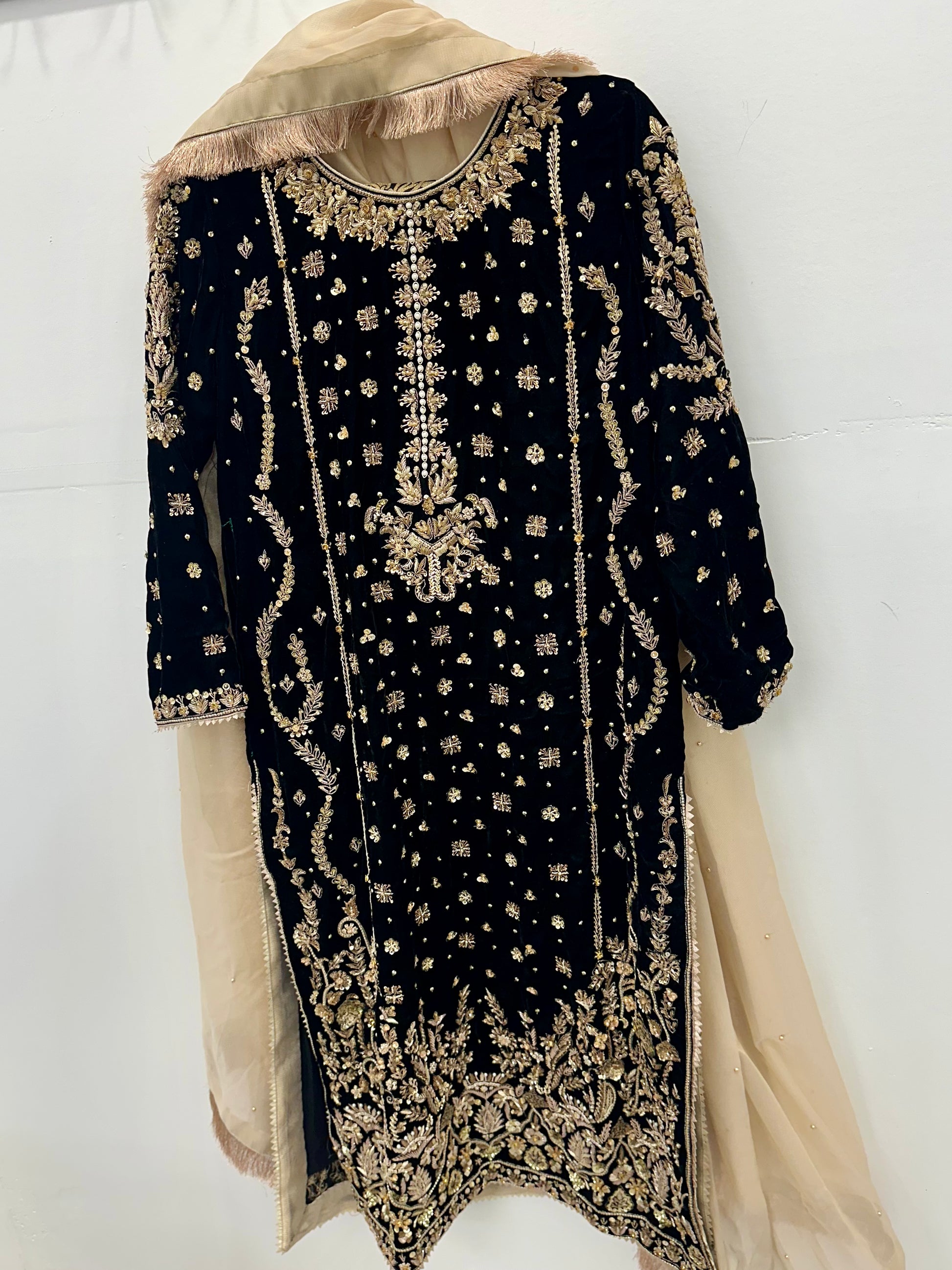 Black velvet three piece with very intricate hand work. Katan trouser. Exclusive wear. For custom size please visit shop to place order