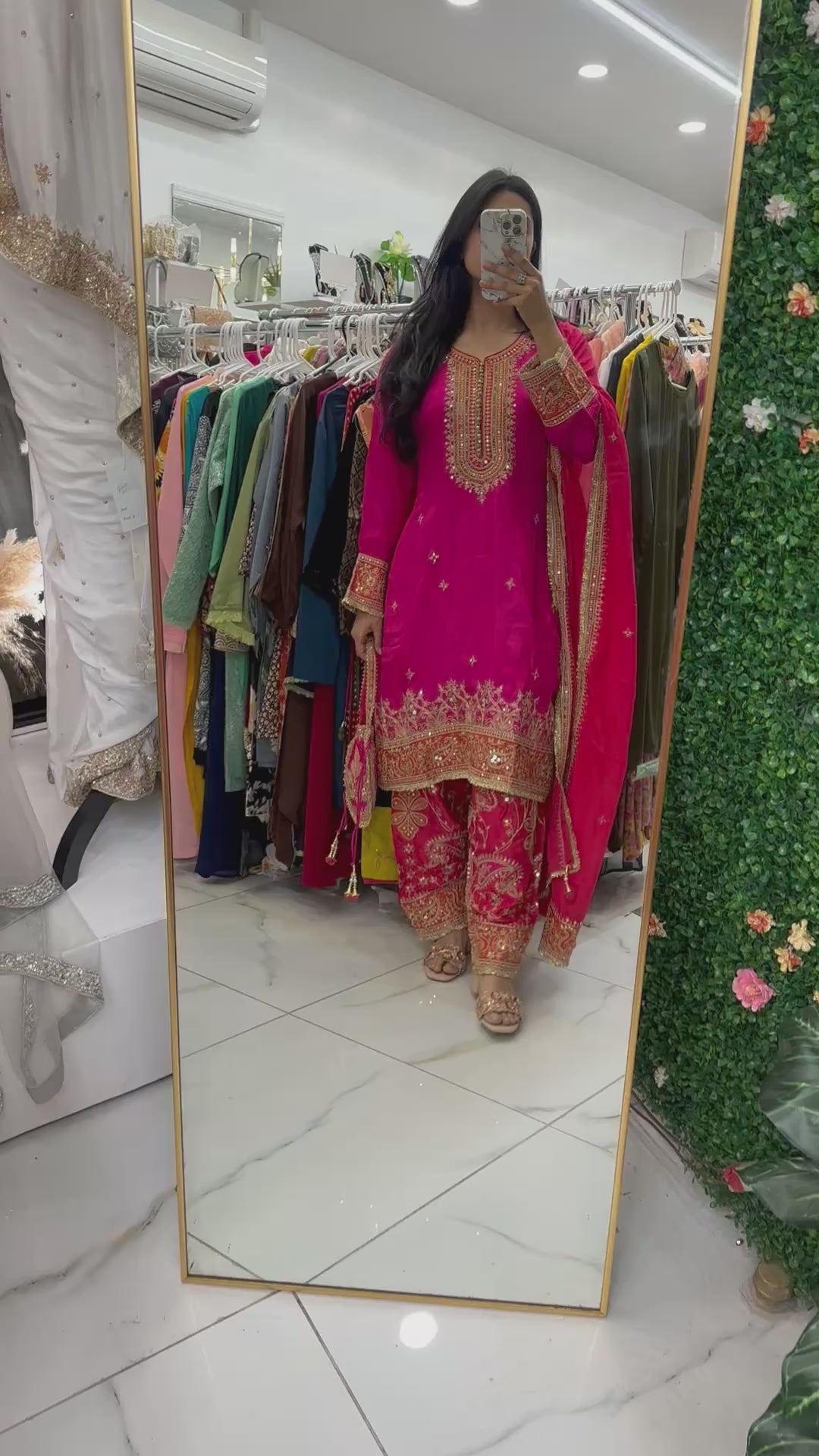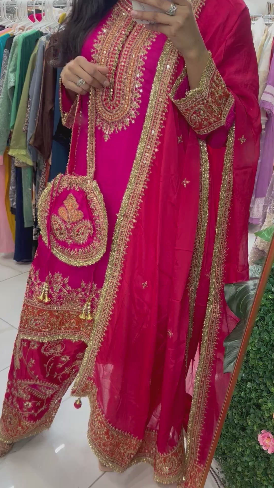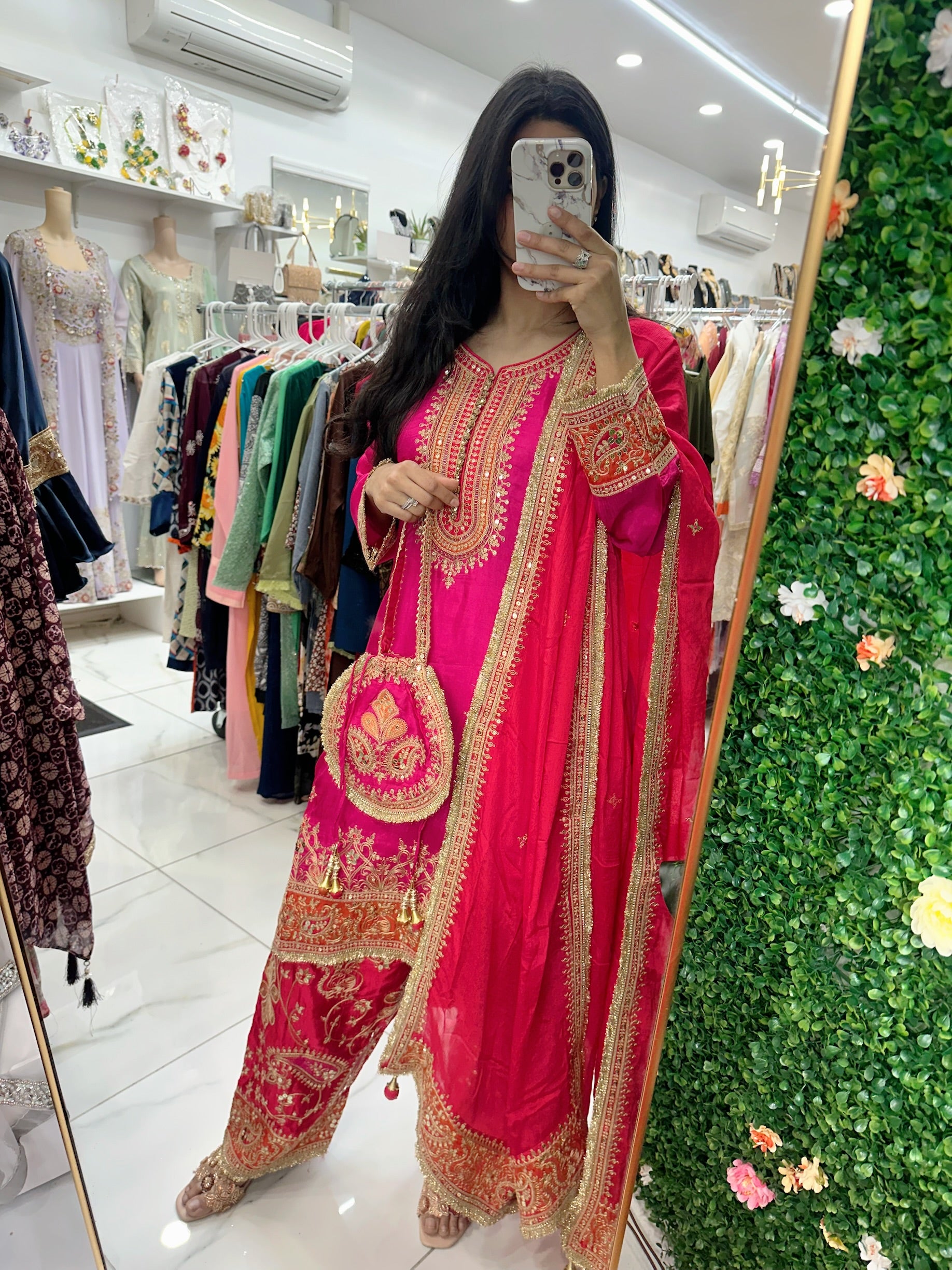 Beautiful silk suit with beautiful embroidery work and sequins. Pants have amazing work details in salwar style.
