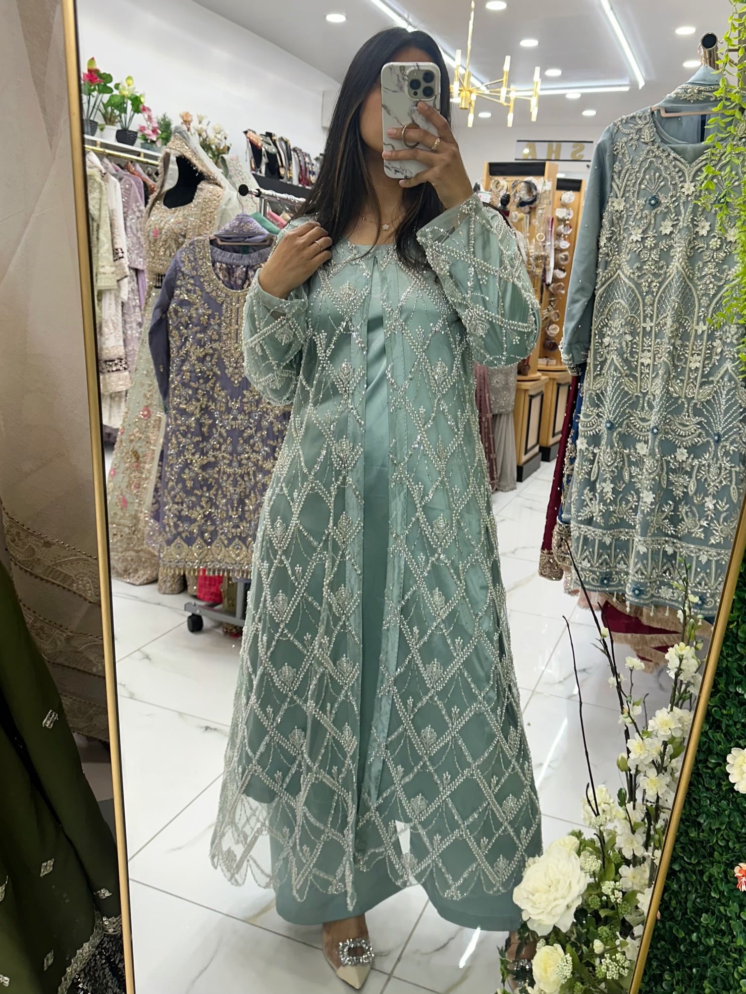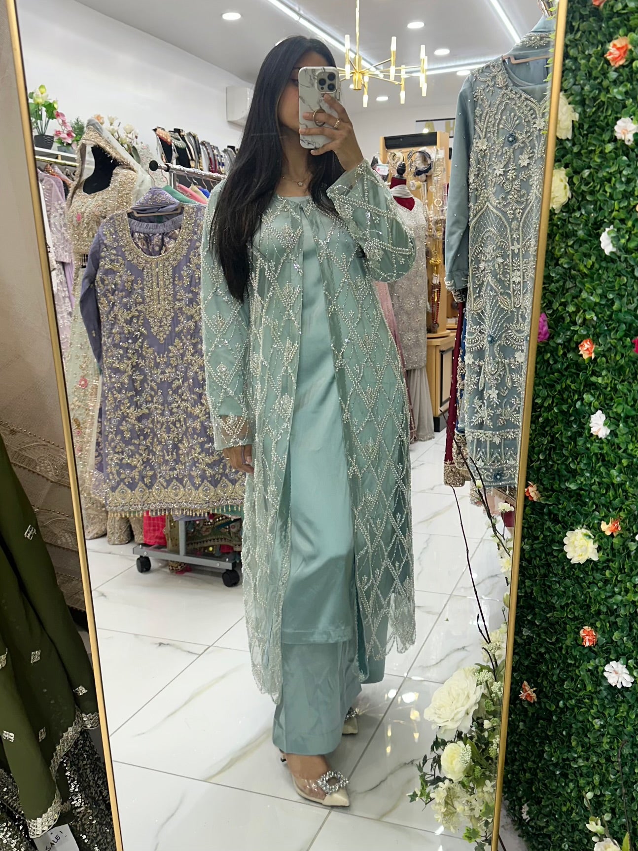 Three piece, premium silk with hand work jacket With kameez and palazzo pant