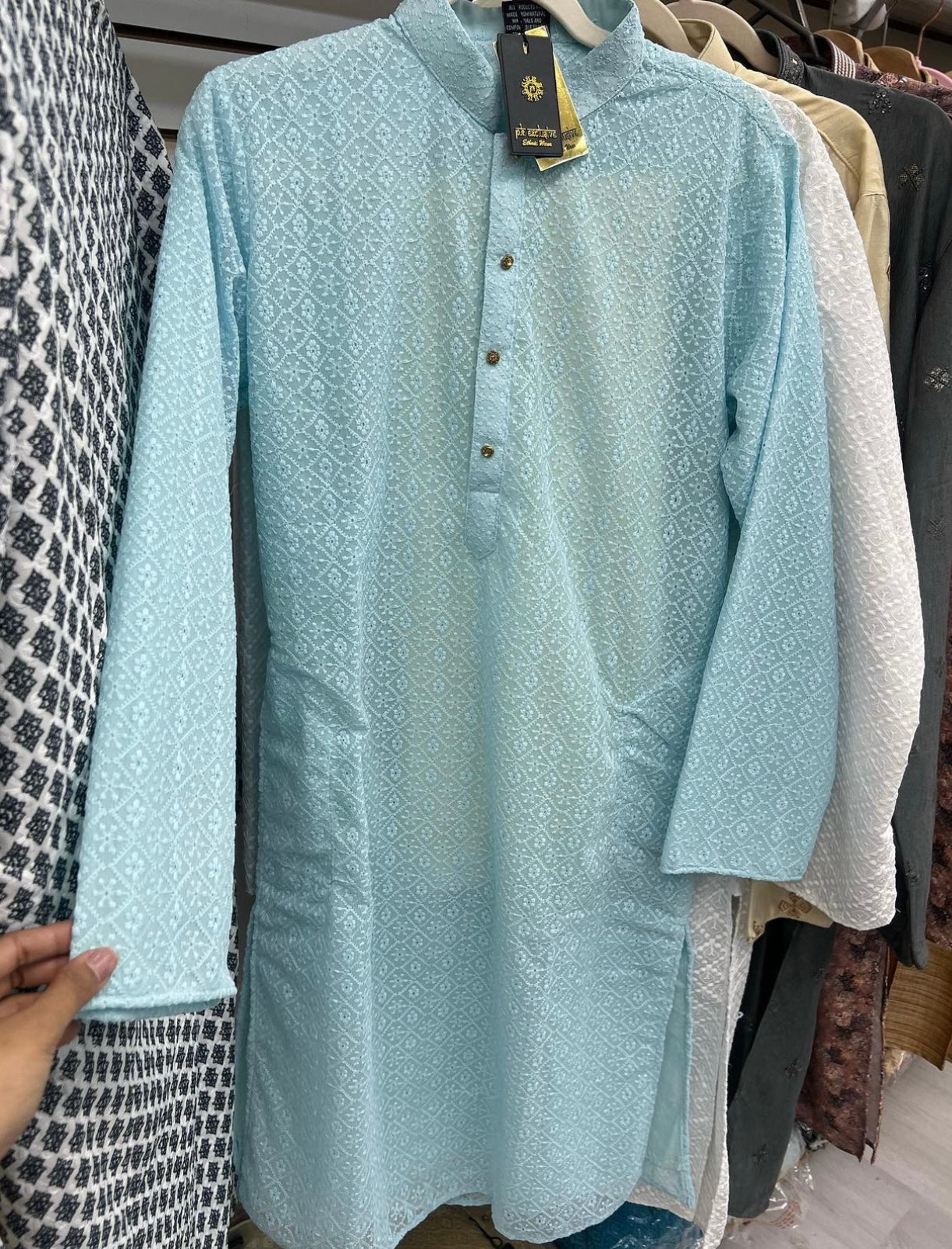 Chiffon kurta with cotton linning, comes with light gold straight trousers