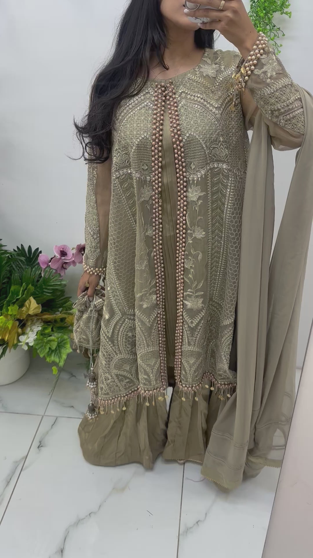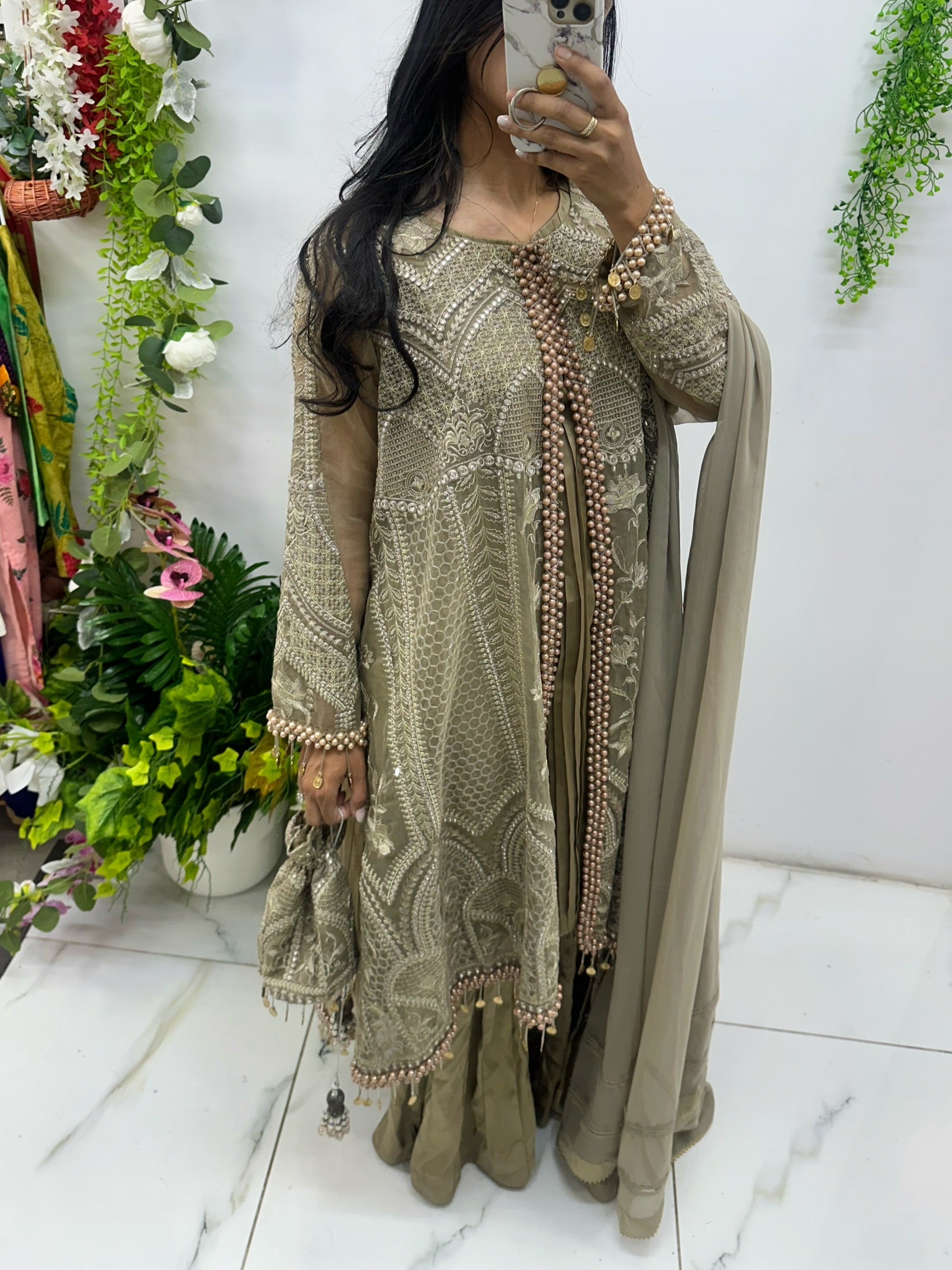 Beautiful net jacket with pearl work. And premium silk gharara pants and kameez. Comes with dupatta and a matching potli bag