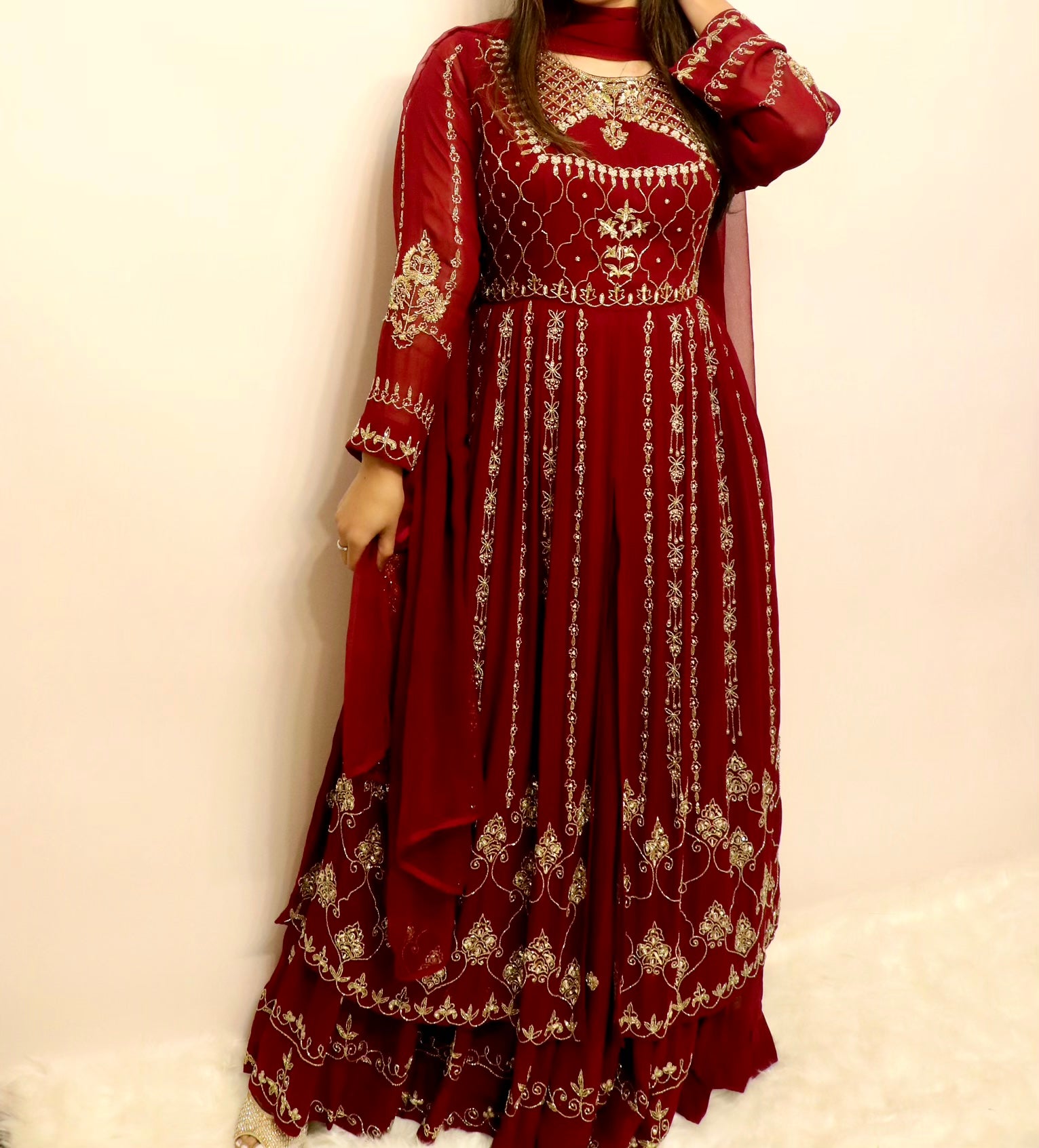 Beautiful georgette anarkali style with heavy bead jewelry hand work and slit in the middle. Skirt on the bottom with beautiful bead work. Georgette plain duppata.