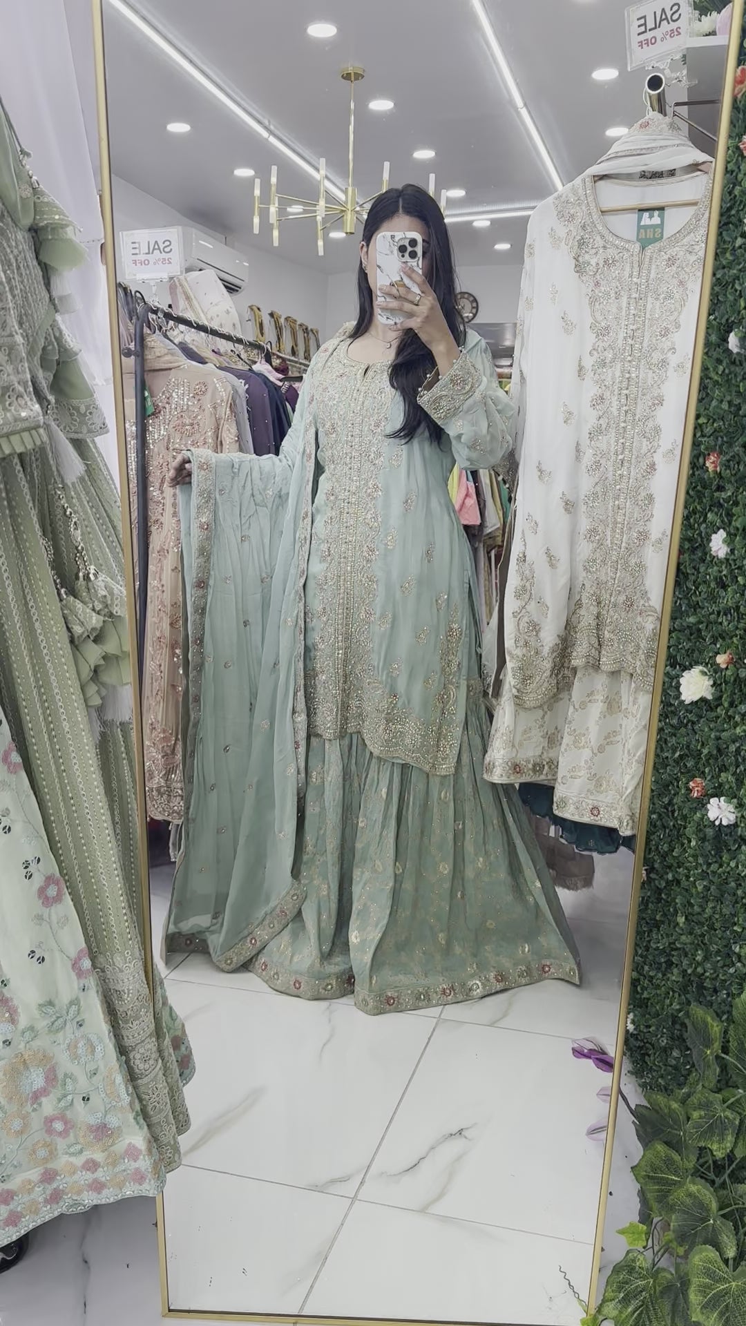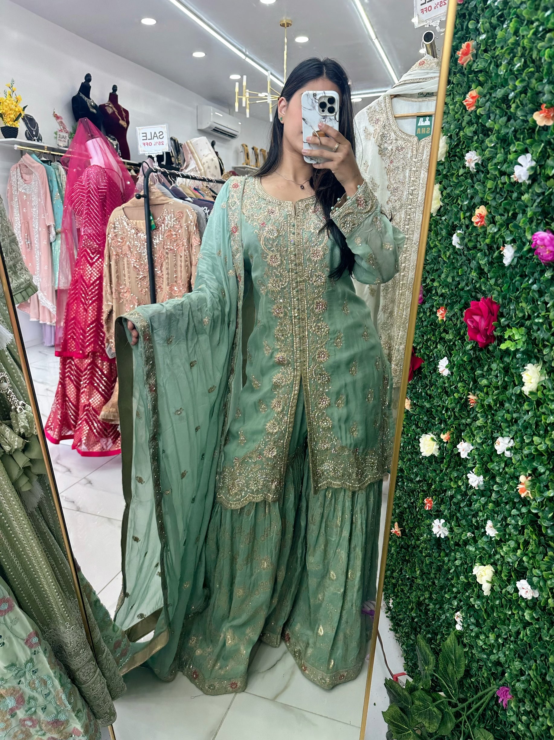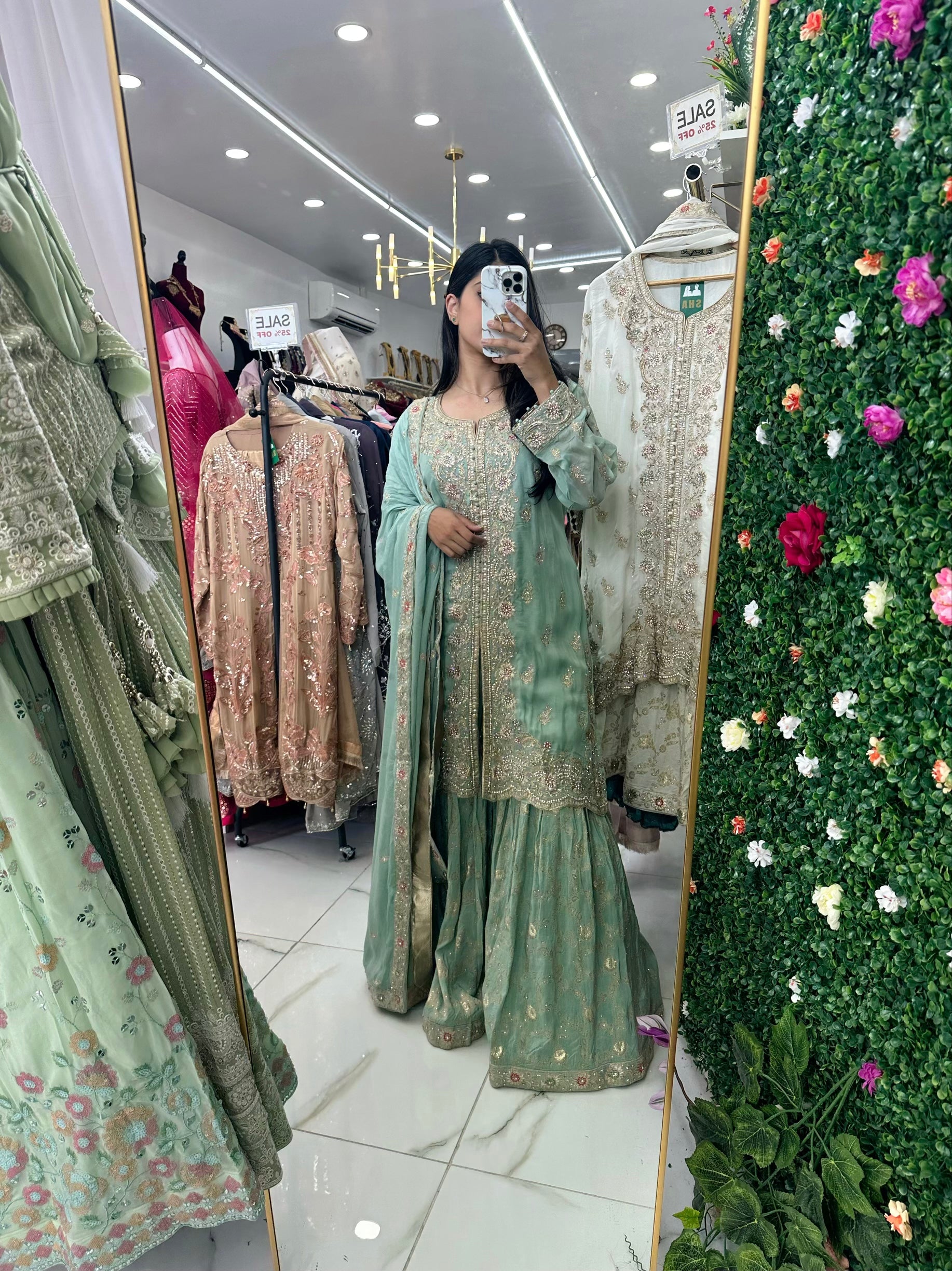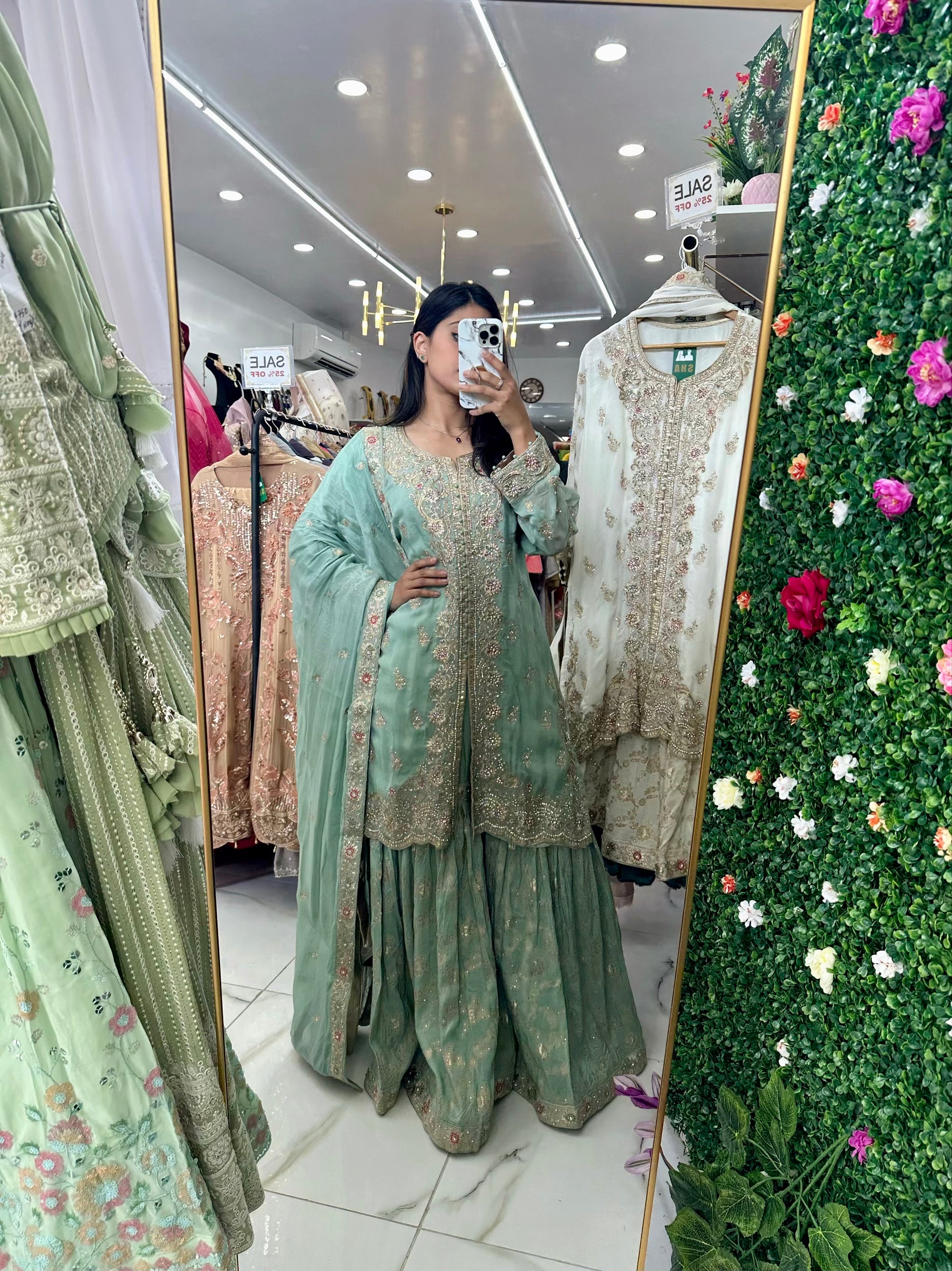 Beautiful silk suit with banarasi pants. Heavy embroidery details with stones to sparkle