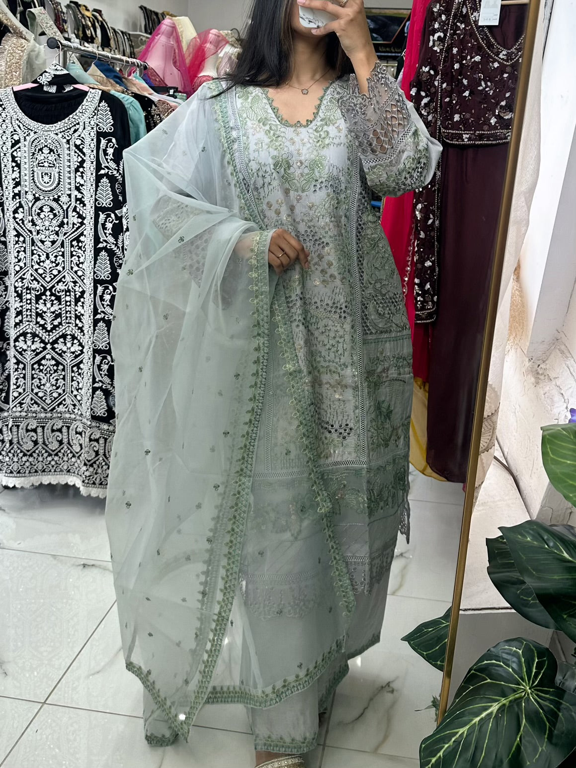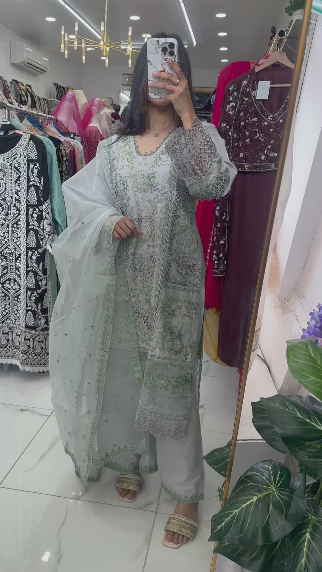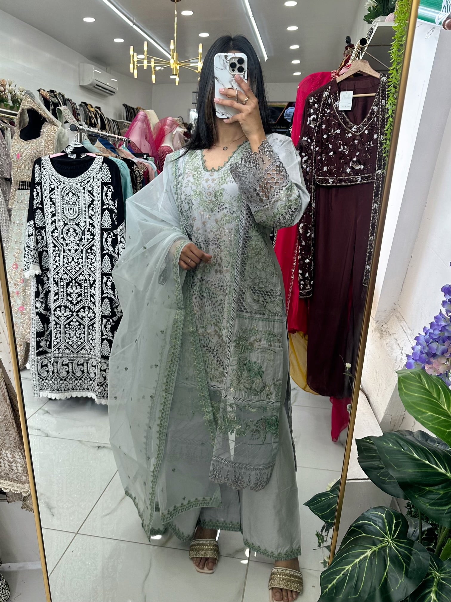 Lawn cotton chikankari suit with silk palazzo and organza duppata