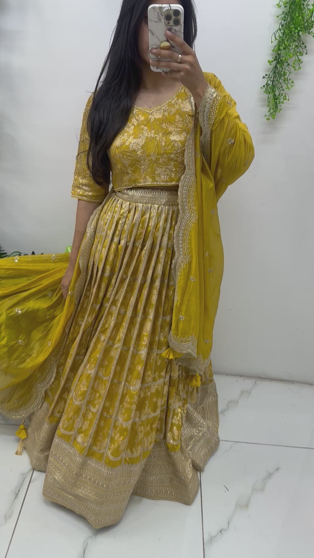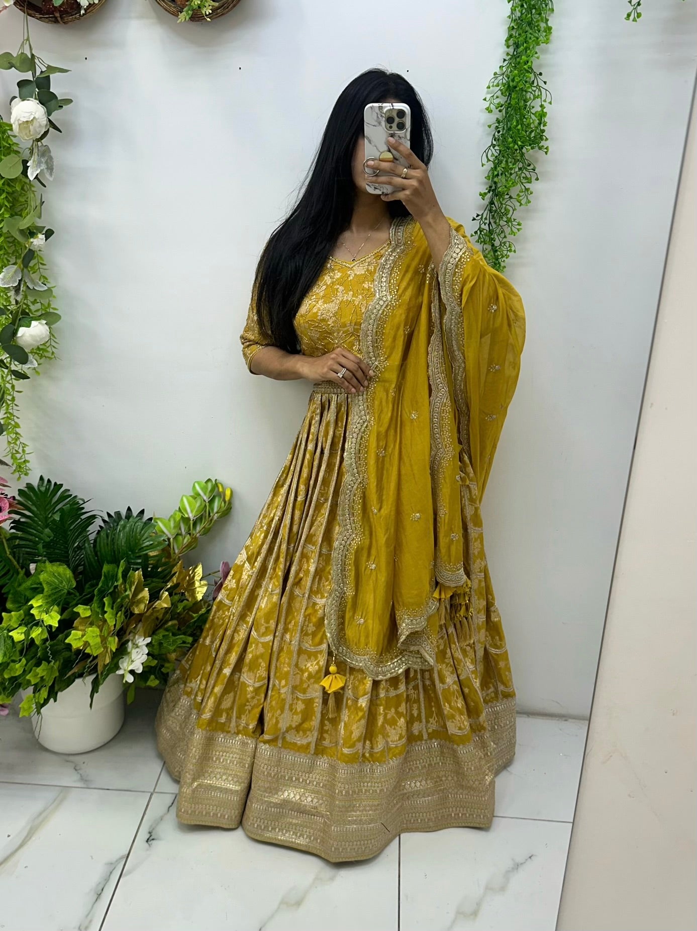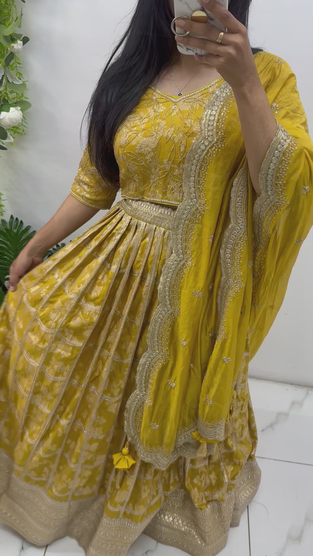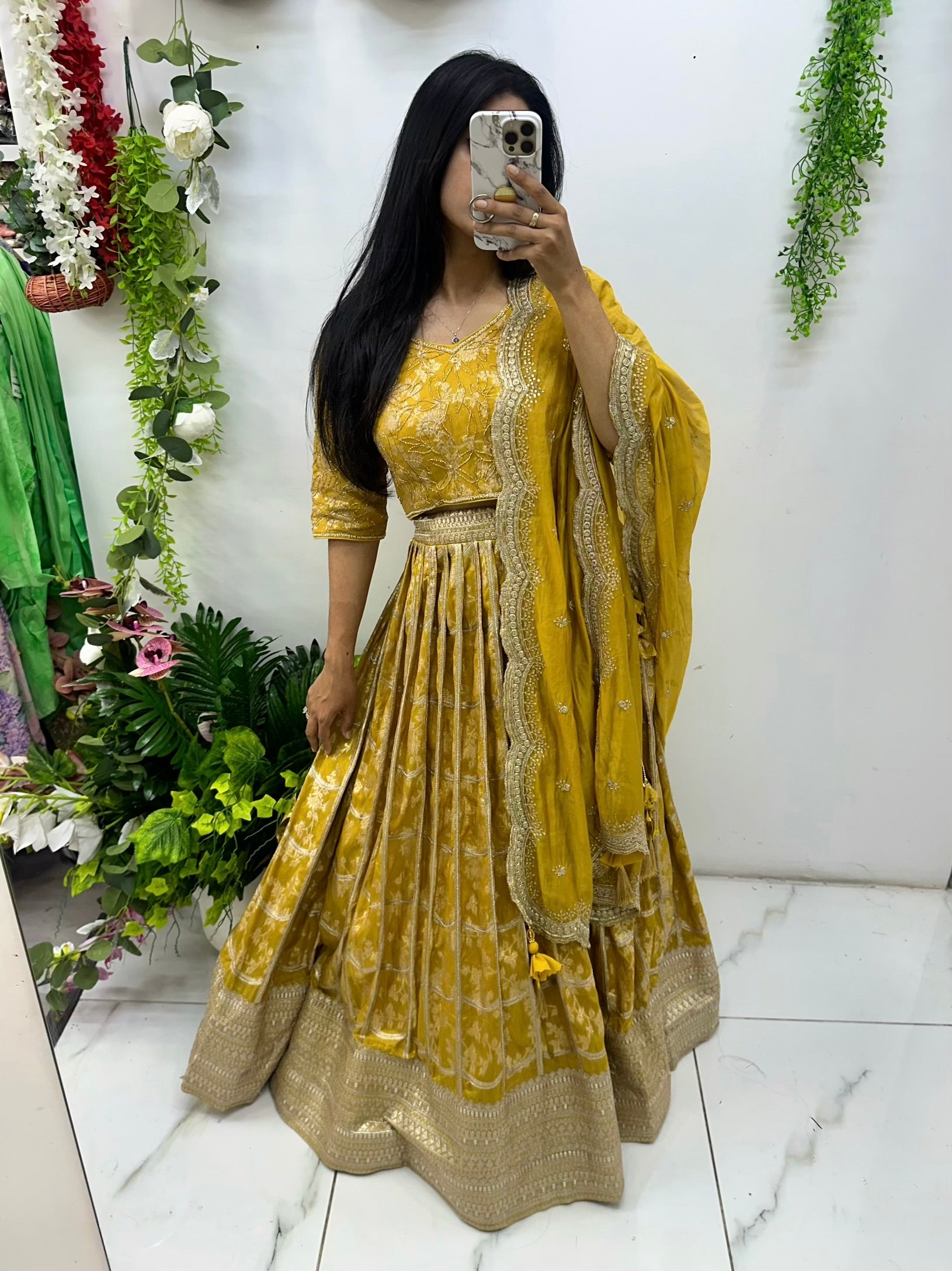 Mustard yellow Banarasi hand work lehenga