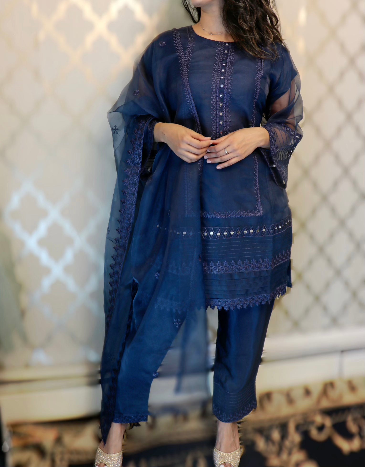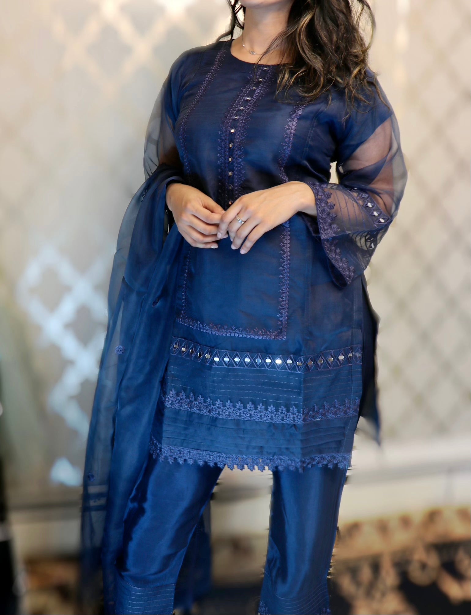 Beautiful lace and embroidery work, silk trousers and heavy work dupatta