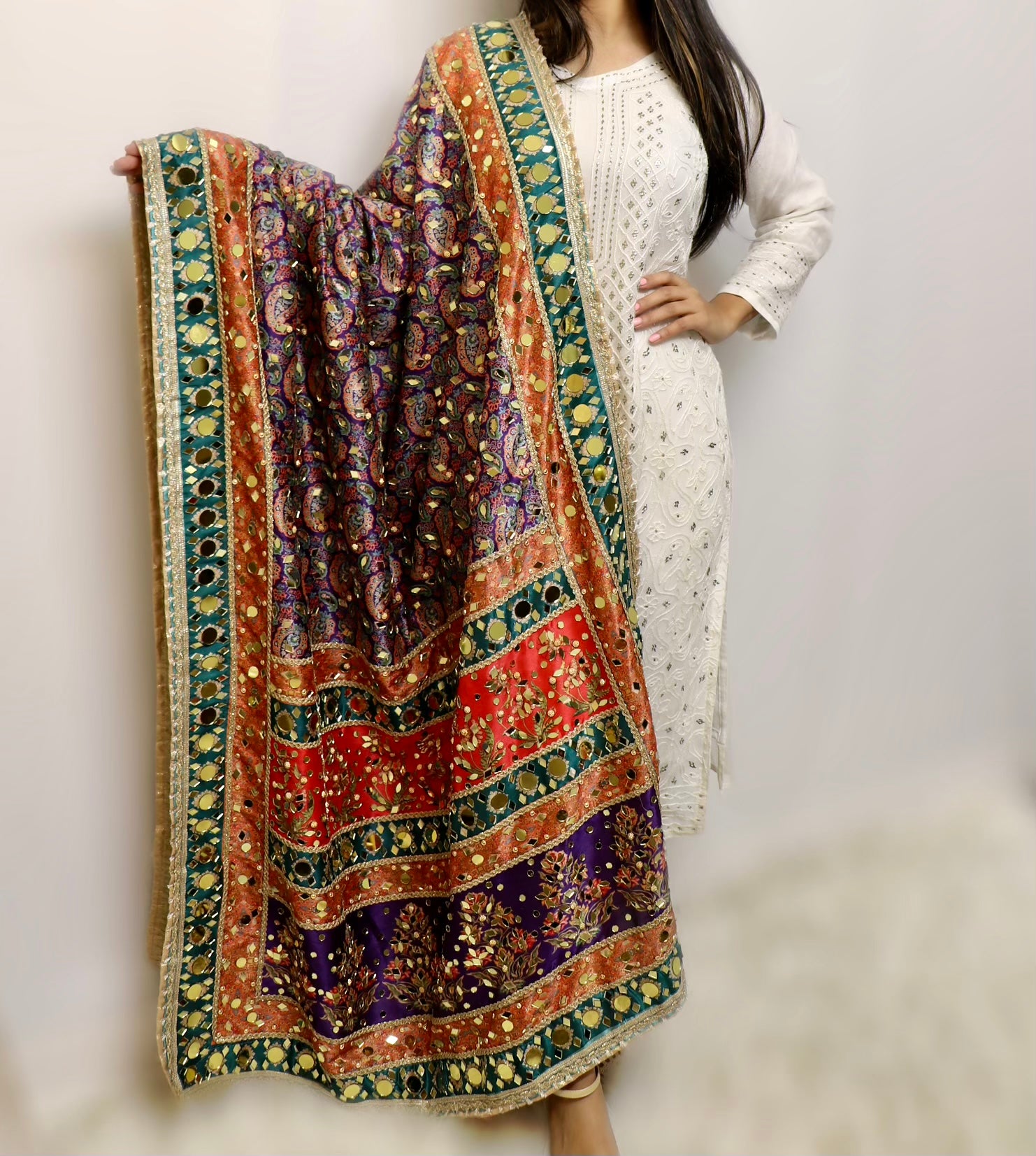 Raw silk large mirror multi color dupatta