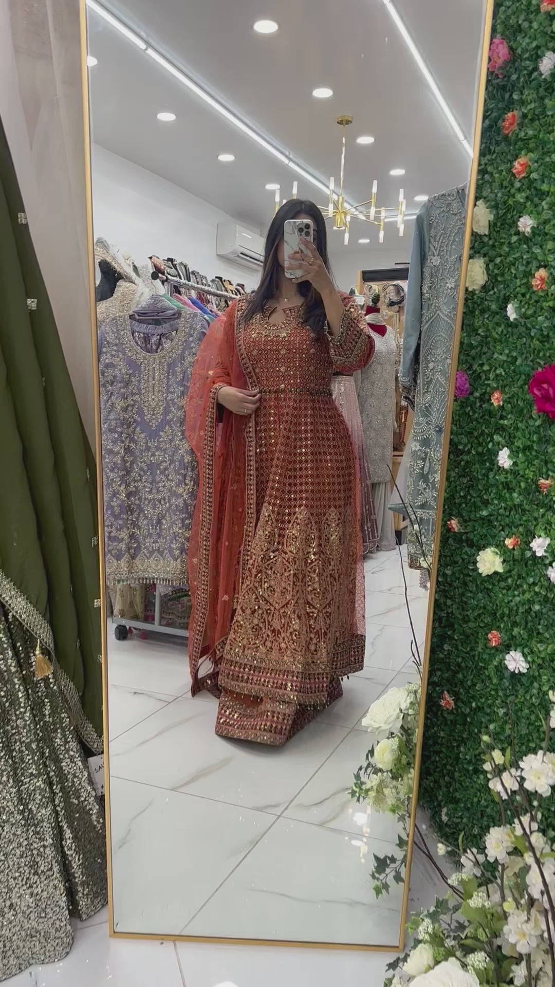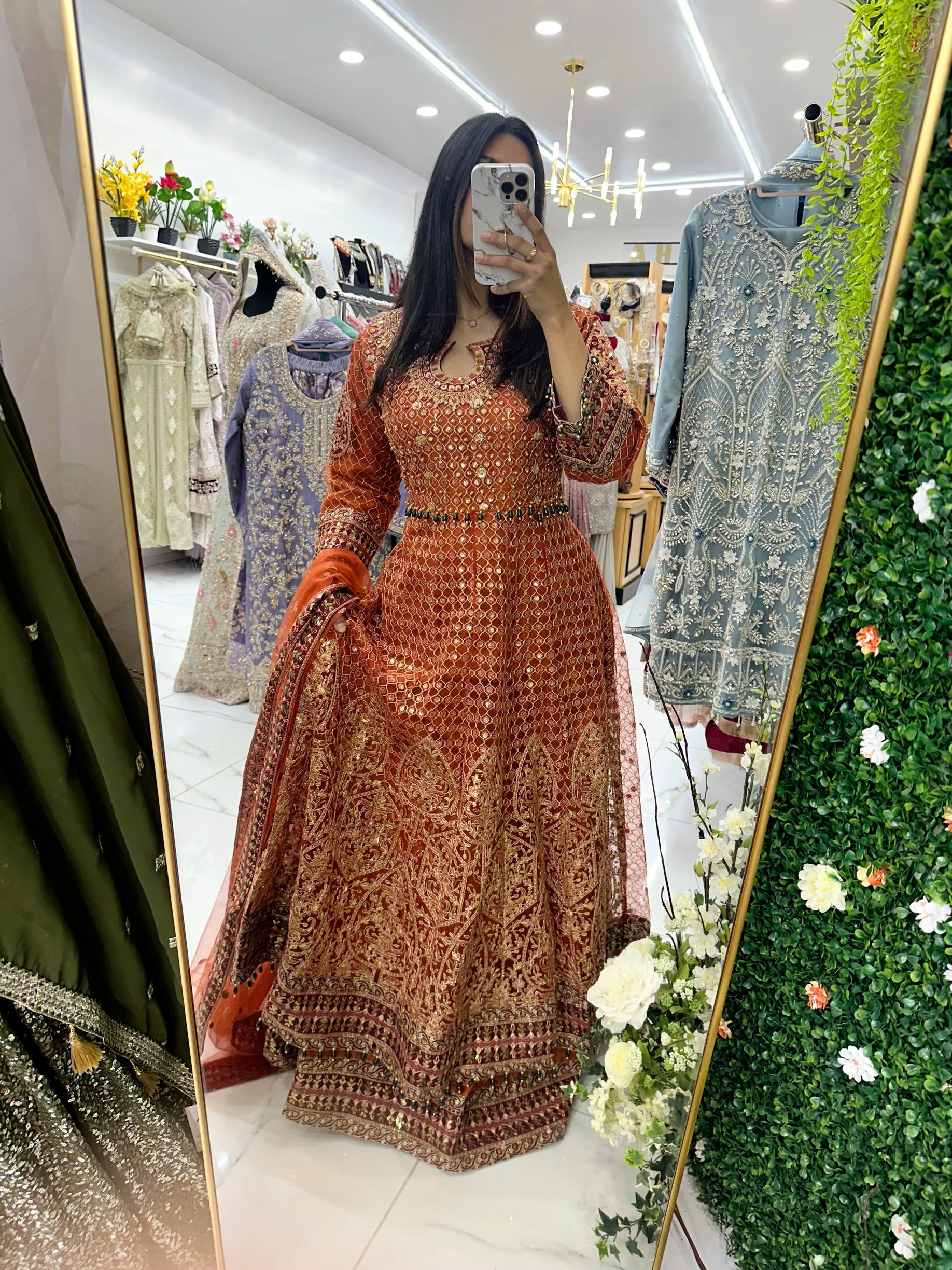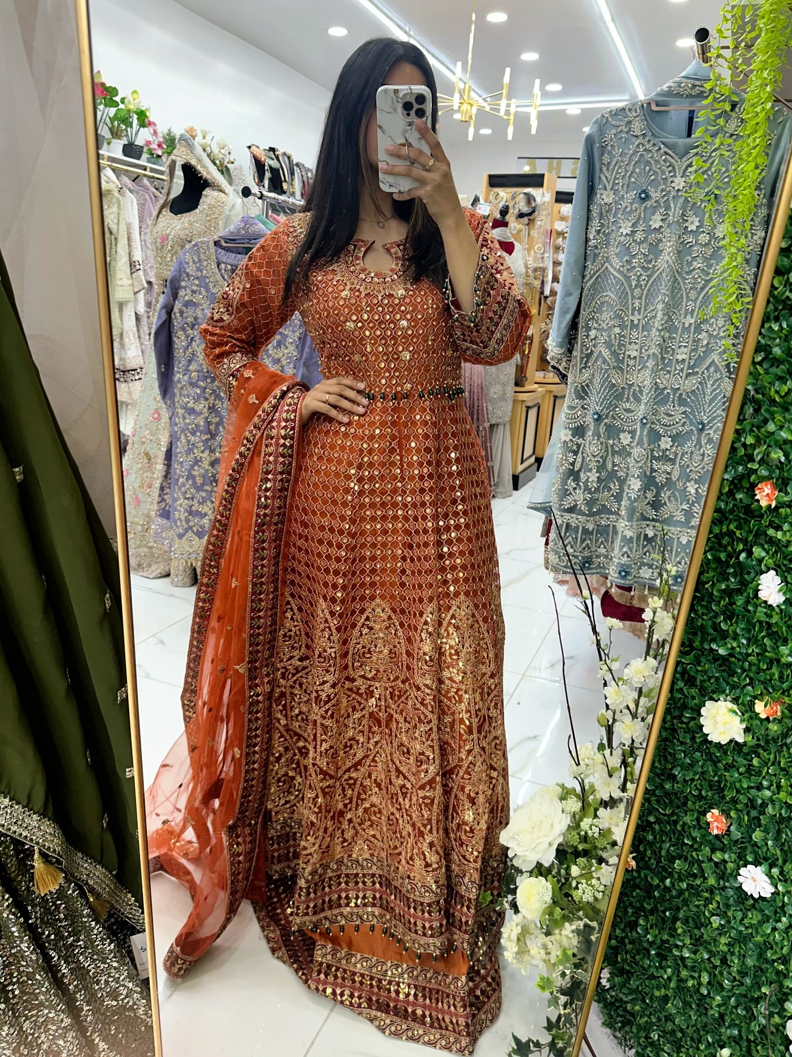 Heavy party wear maxi suit in rust. Soft net fabric lots of intricate embroidery & stone bead, pearl work. For reference, in the video she is wearing a size small which fits a bust size 38