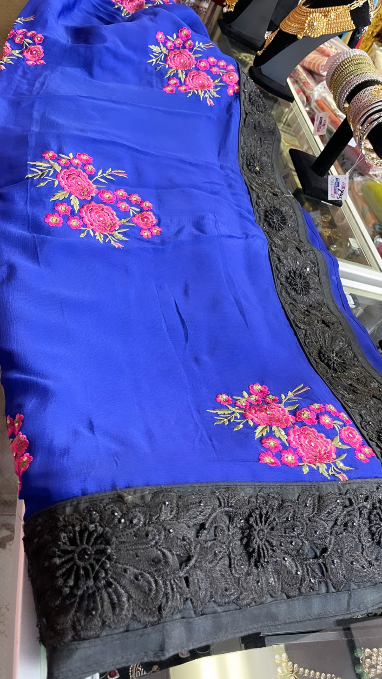 High quality soft silk with embroidered floral. Comes with unstitched blouse piece in black and border lace