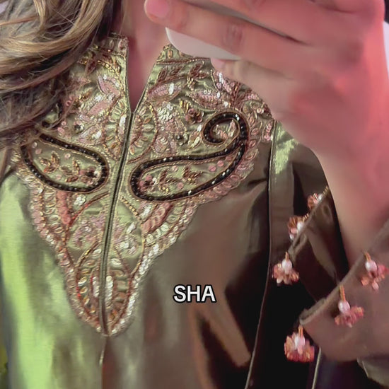 Luxurious pure silk tissue, hand work embellishments and unique style stitching