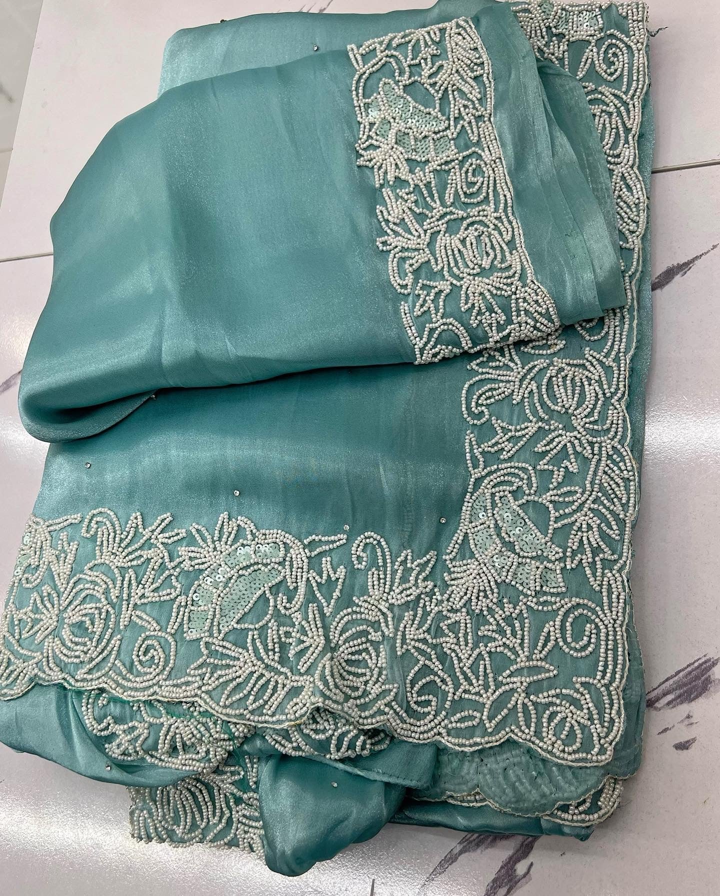 Shiny blue organza saree with pearl work