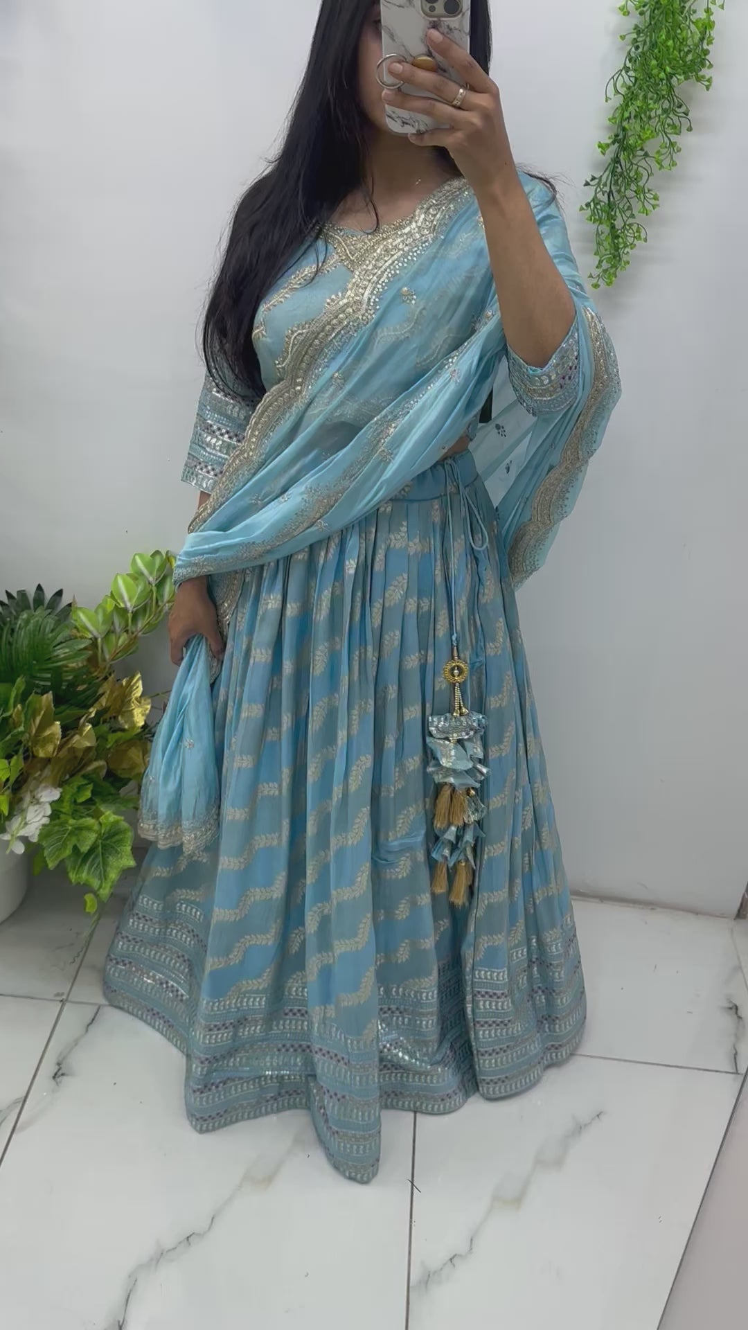 High quality silk Banarasi lehenga with lots of flairs. Very soft & comfortable. Blouse has hand work beads & beautifully cut work duppata. Skirt length 42 inch.