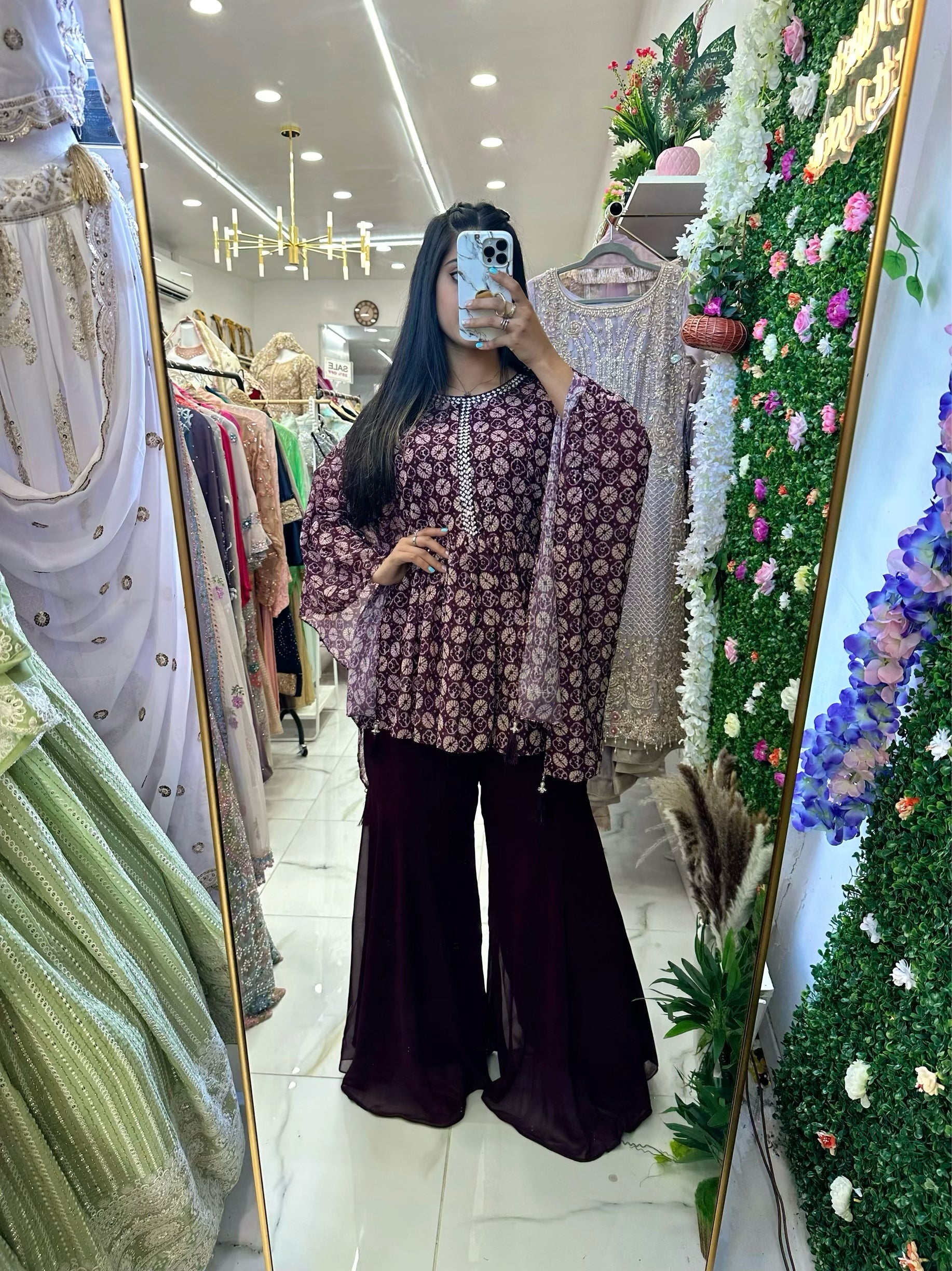 Purple short kaftan top with gharara pants