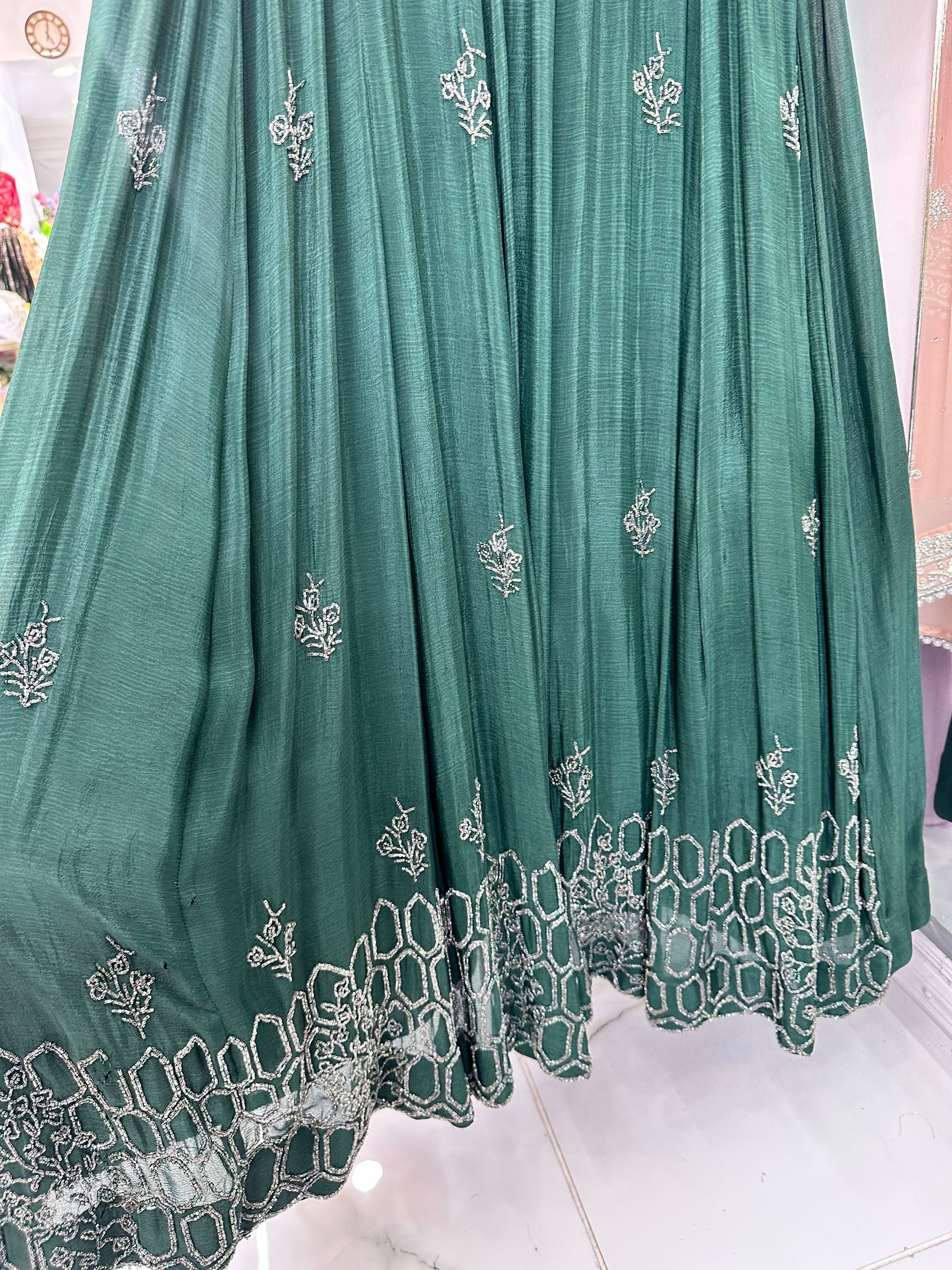 Very heavily made party gown with belt and duppata. Pure silk chinon