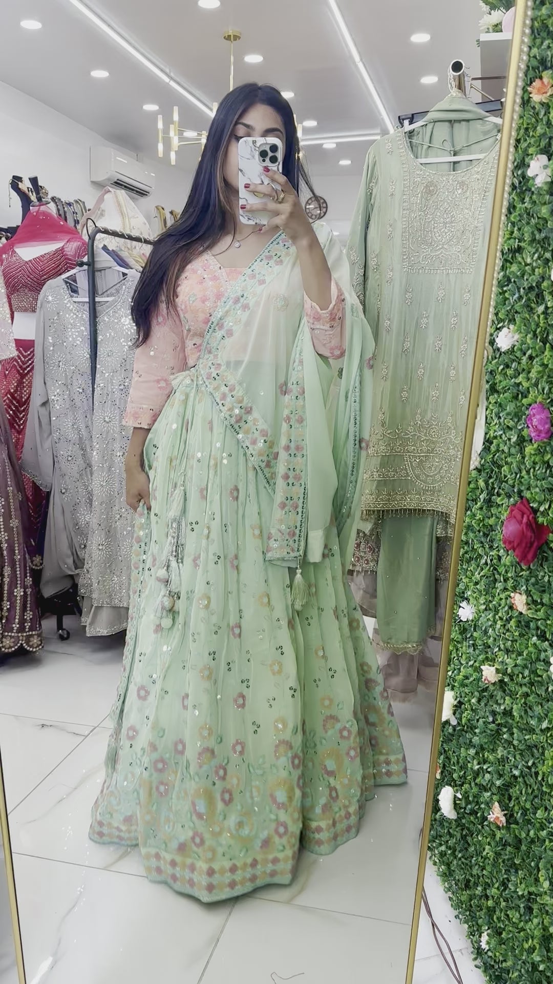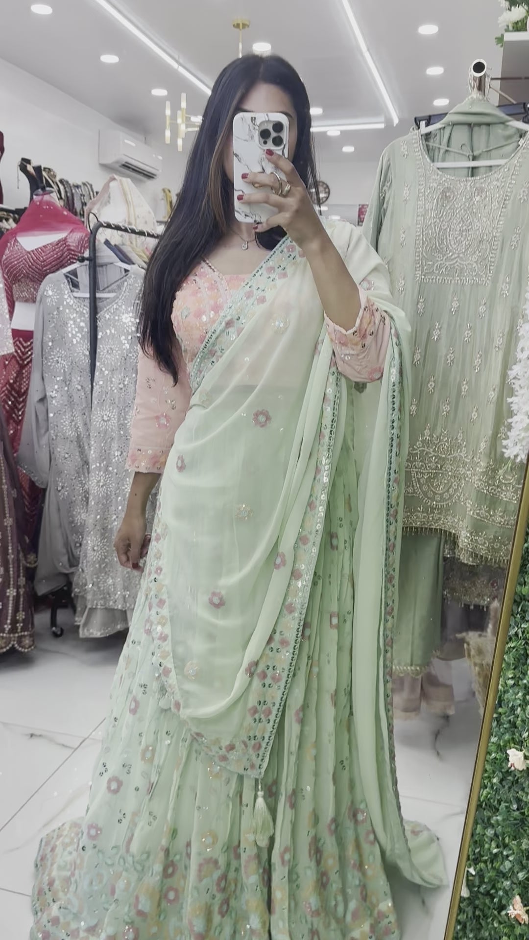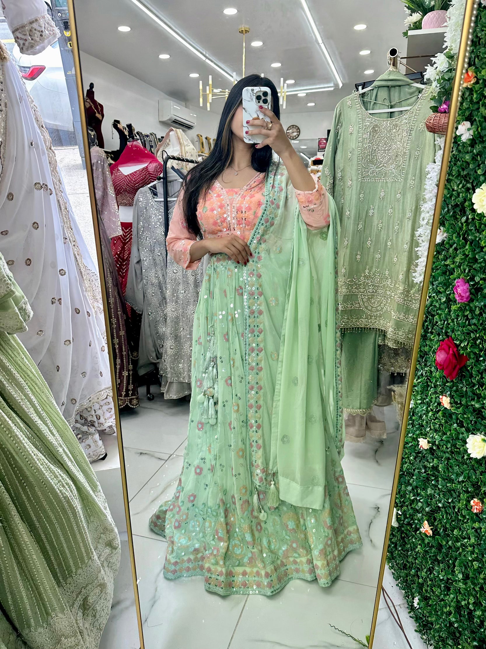Green and peach contrast georgette party lehenga