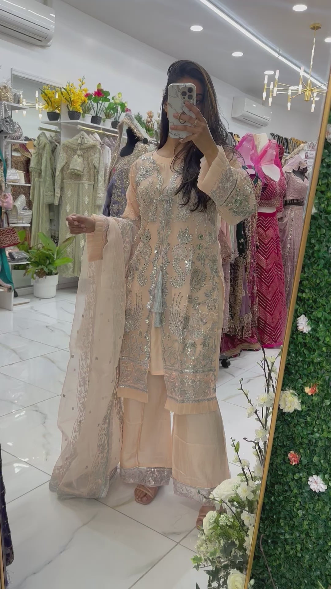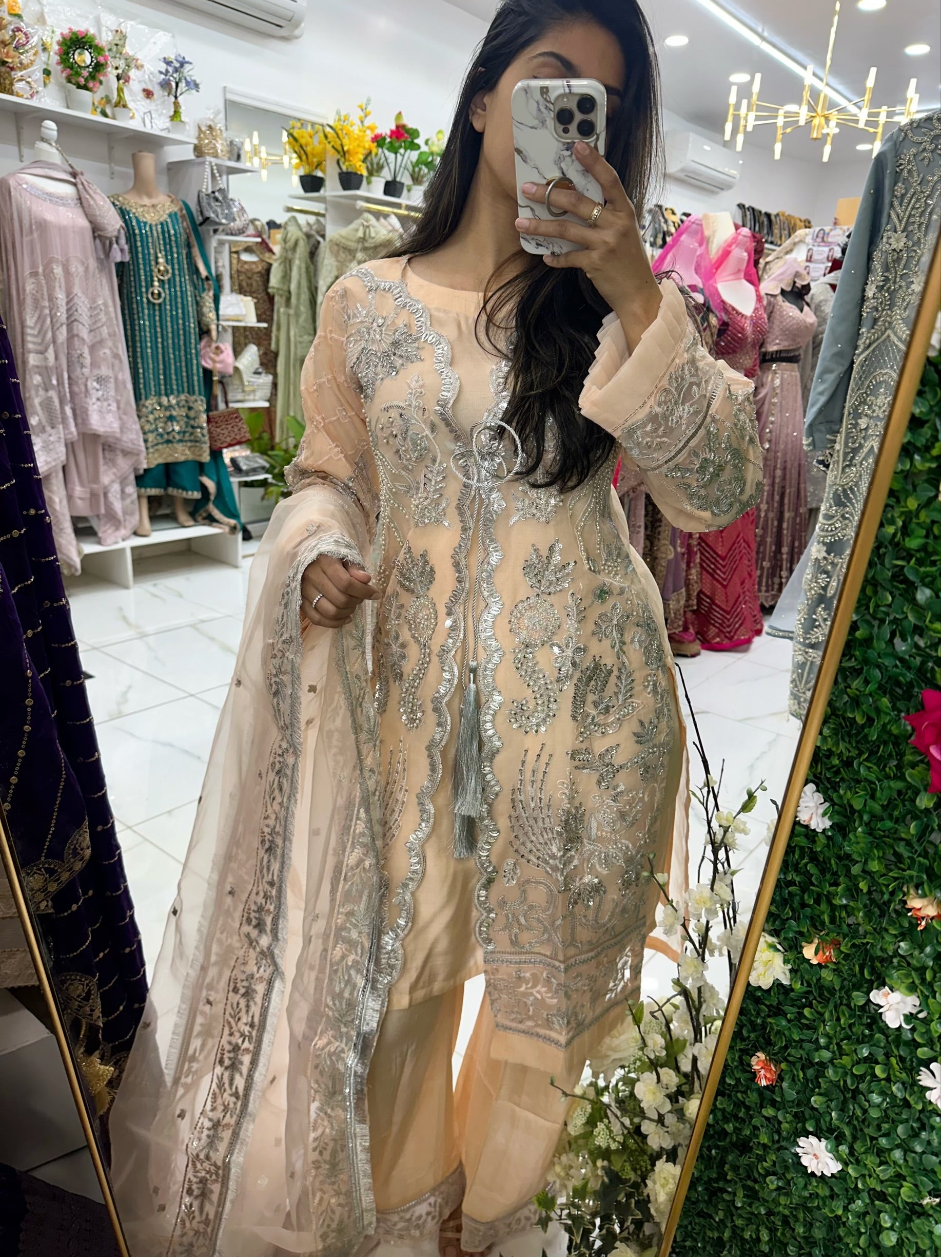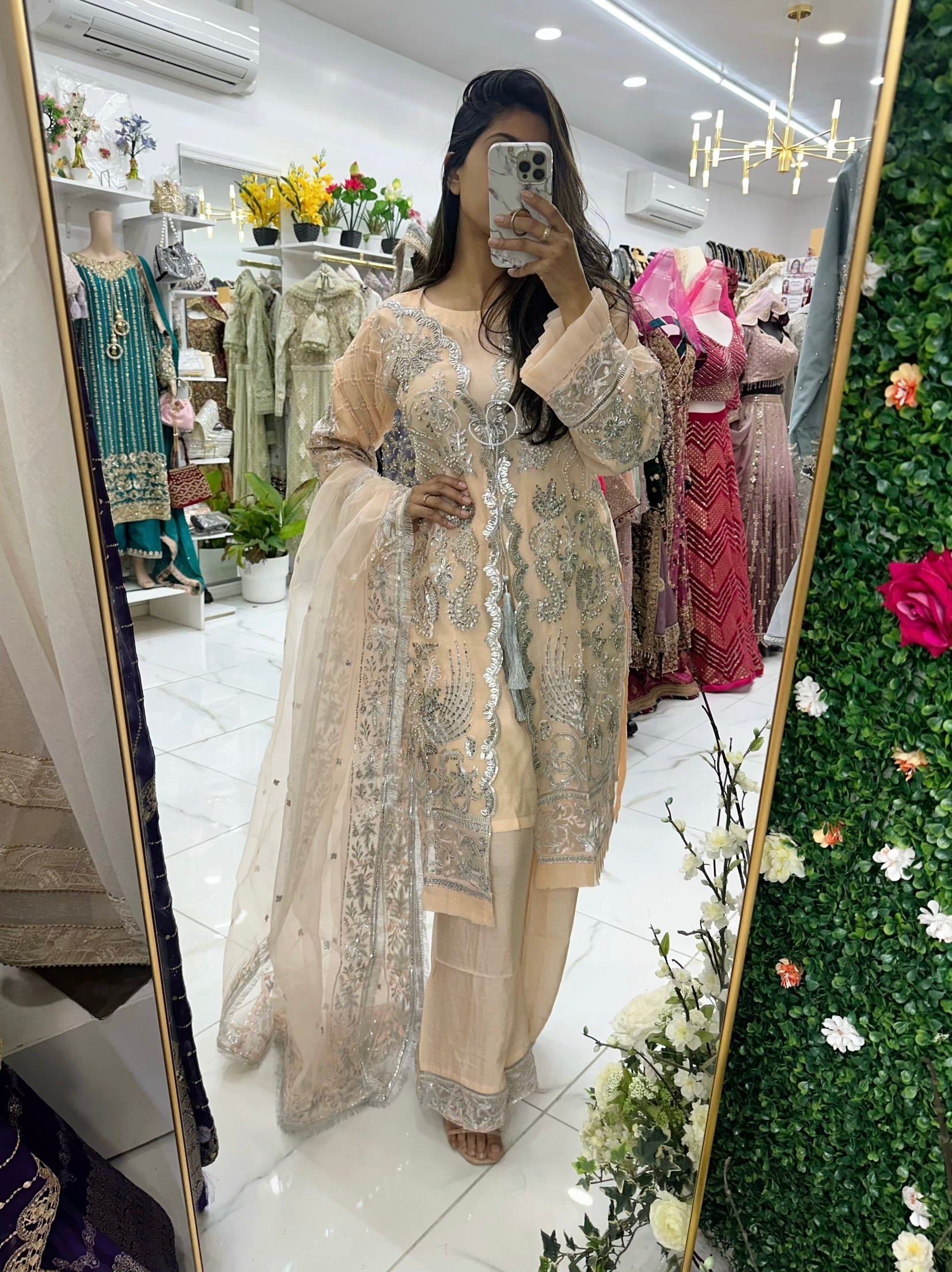Peach with silver embroidery & stone work. Net jacket with silk trouser and kameez