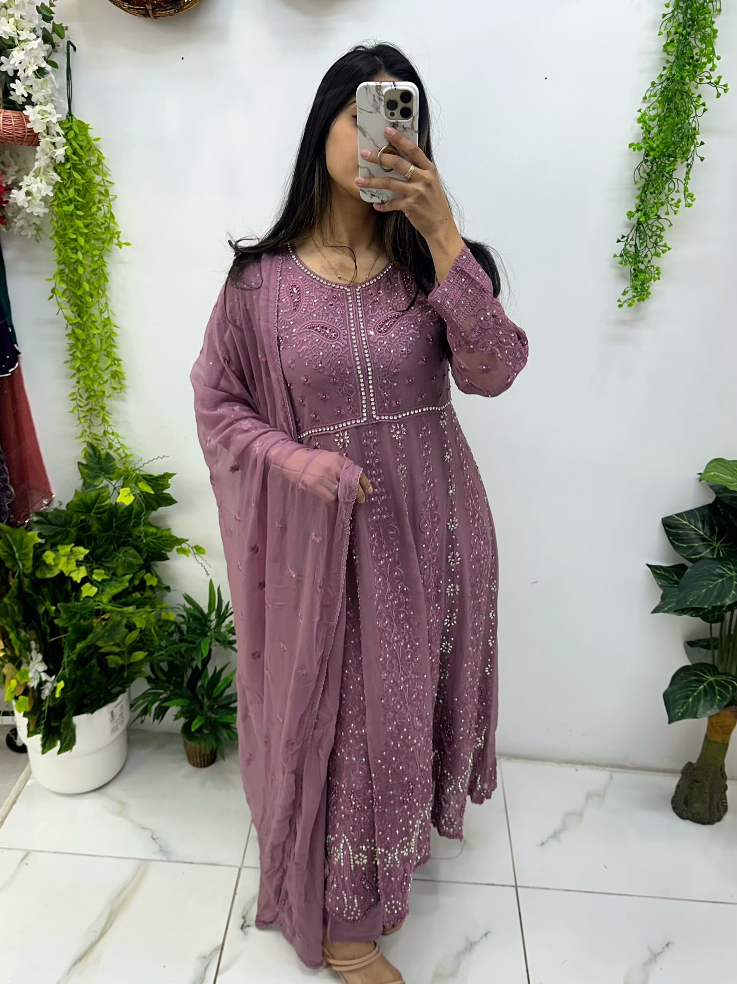 Chiffon with lots of embroidery & stone work. Comes with silk trouser