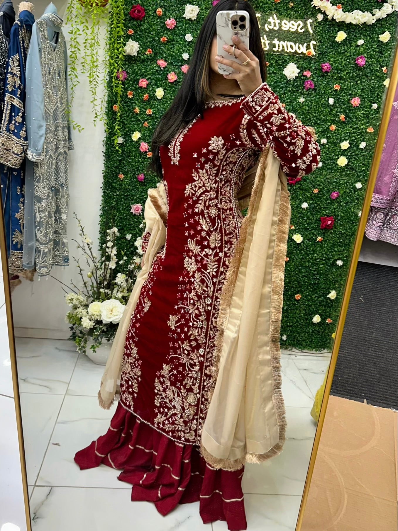 Velvet top with beautiful zari, hand bad, zardozi, mirror hand work with mixed silk sharara suit. Masoori duppata.