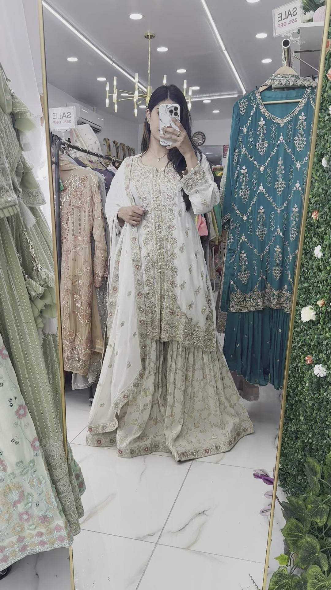 Beautiful silk gharara suit. Banarasi pants, suit will heavy embroidery & stone for sparkle