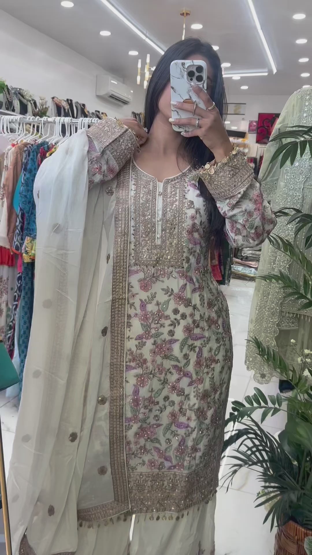 Pure chinon silk with heavy multi color floral embroidery & all over mirror work