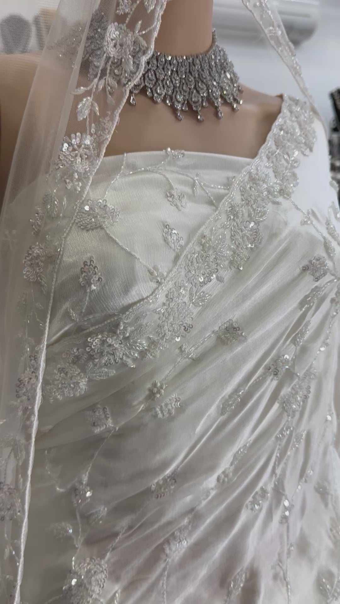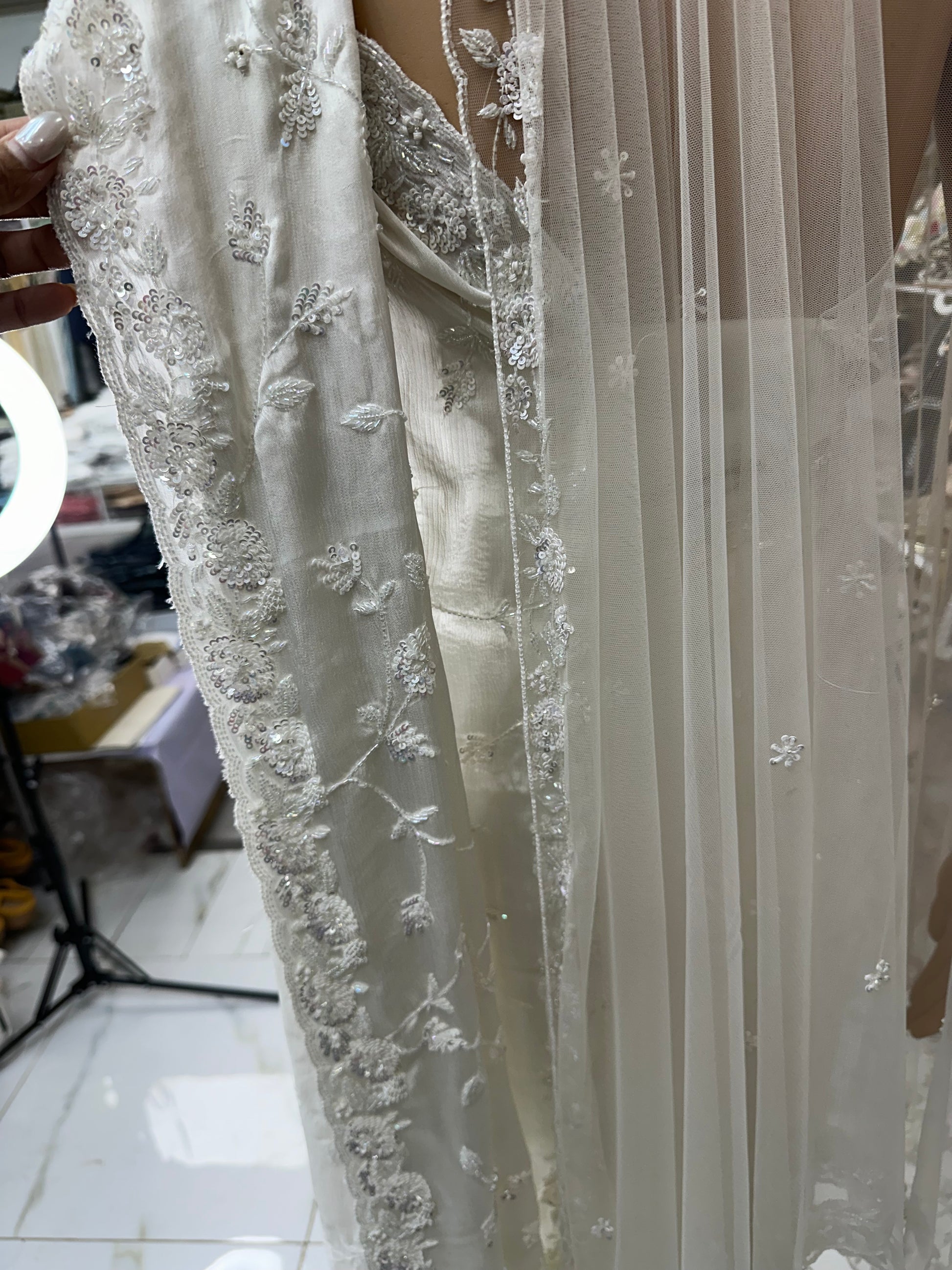 White satin silk hand work bridal saree with duppata