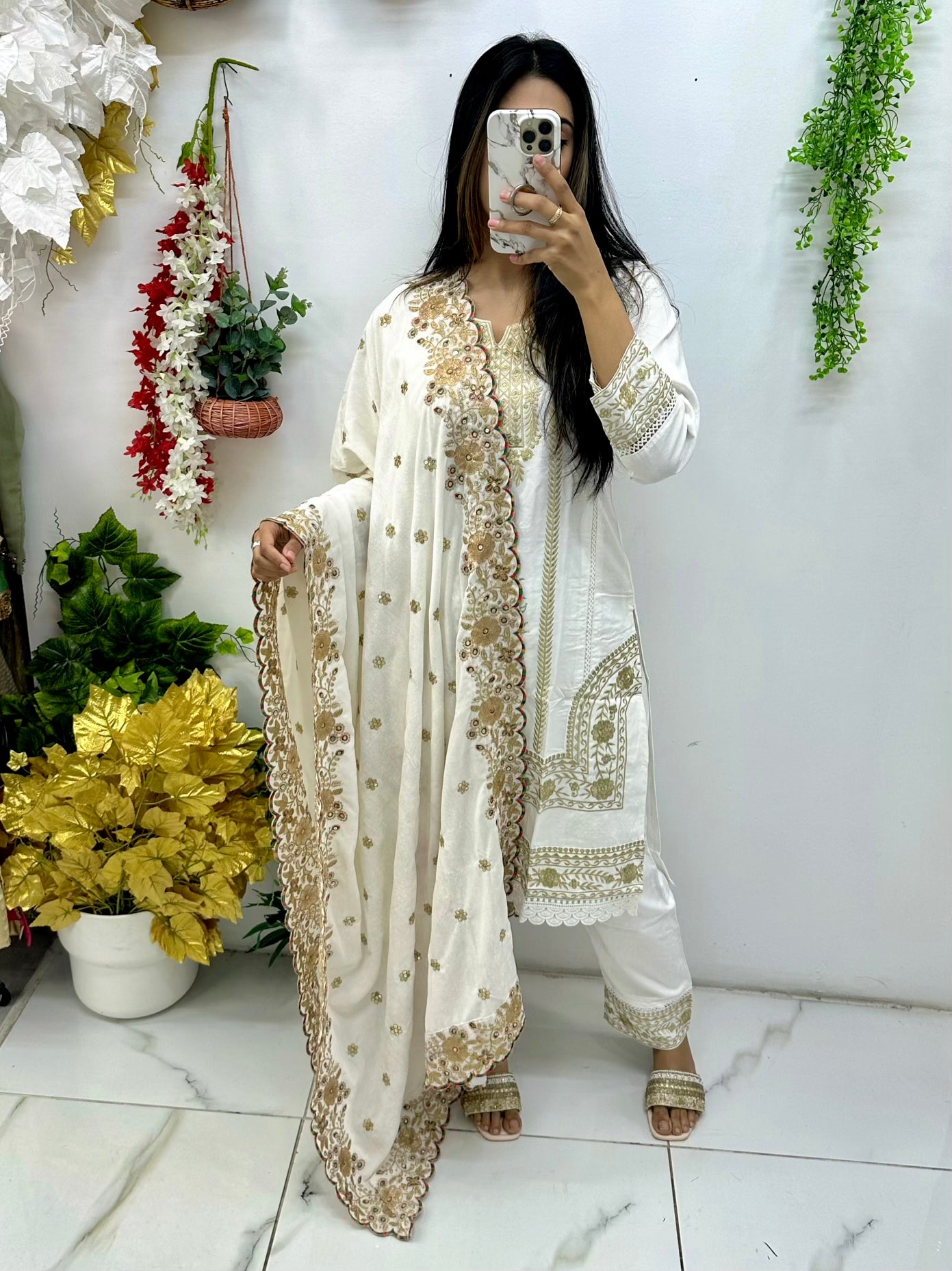 White velevet shawl with sequencing and embroidery work